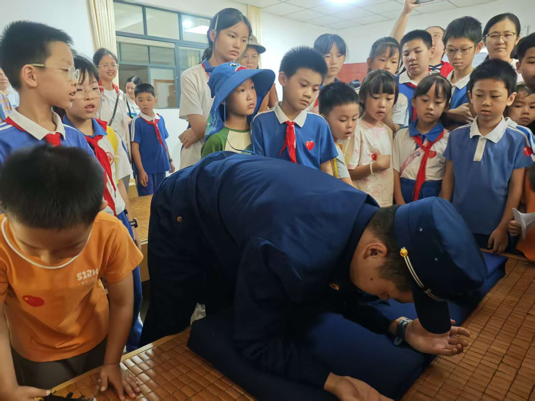 消防员热情地开启现场教学,细致入微地讲解“豆腐块”被子的叠法,从被子的折叠长度、角度把控,到如何巧妙捏出规整的棱角,每个细节都讲解得清晰透彻;另一位消防员则进行实践演练,动作娴熟流畅。