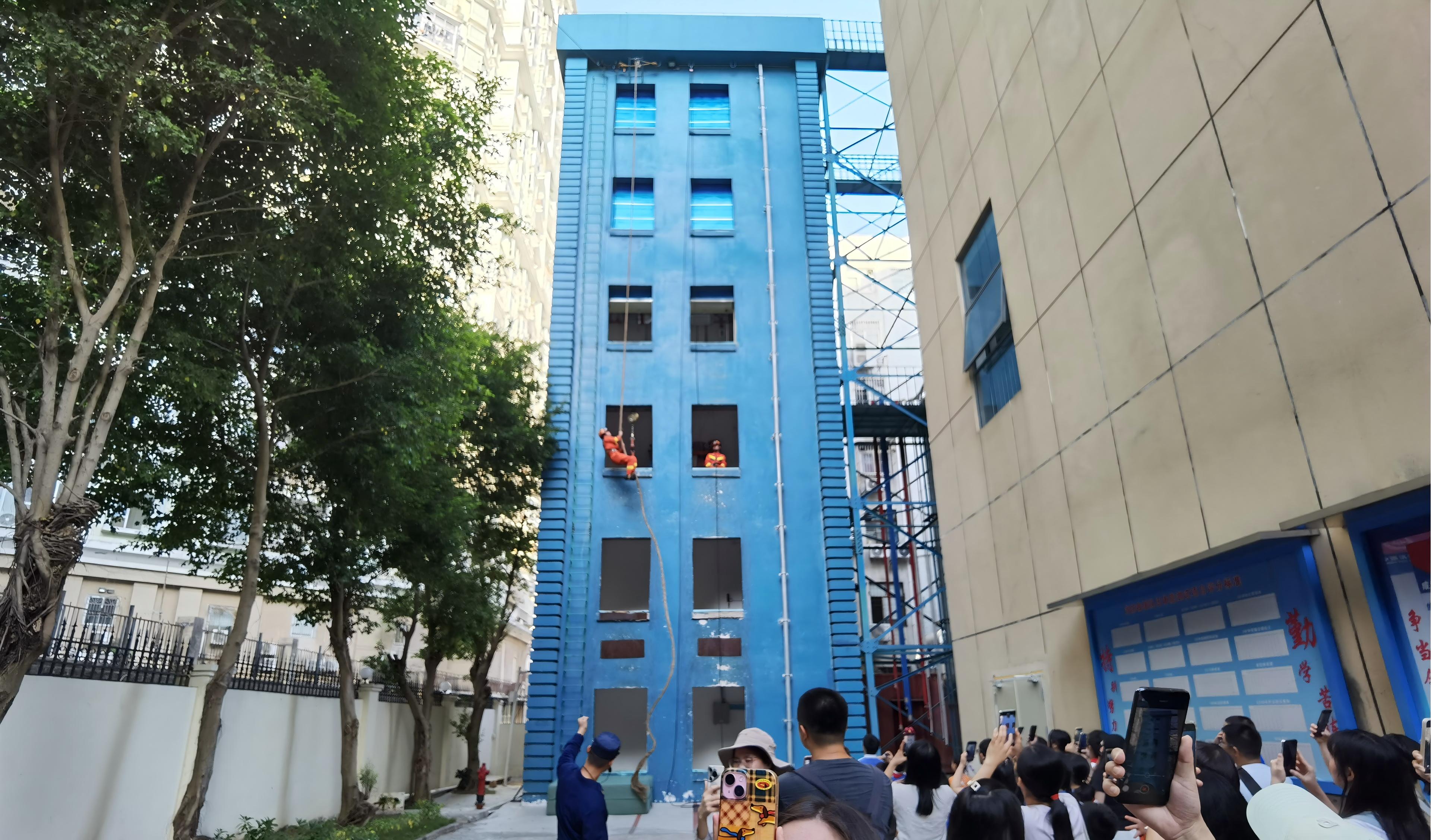 技能展示环节将活动氛围直接拉满!消防员们带来日常训练项目的精彩呈现。一名消防员身手如猿,仅靠一根绳索,眨眼间就攀爬上数层楼高的训练塔,引得现场惊呼连连。