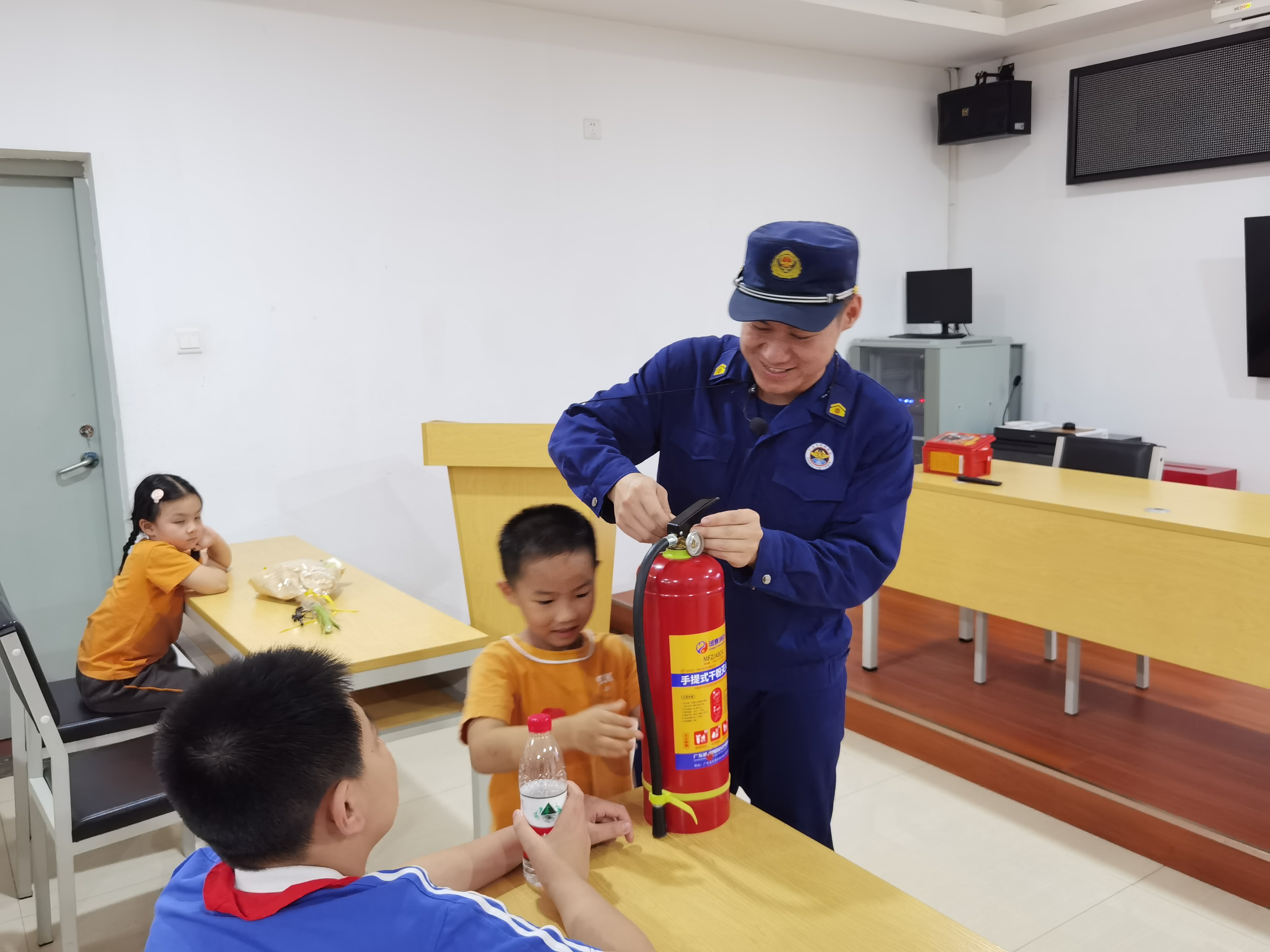 消防安全小课堂是本次活动的重要环节。在会议室内,指导员用生动易懂的语言为家长和孩子们讲解了消防安全知识。他们结合实际案例,详细介绍了如何预防家庭火灾、灭火器的使用、如何正确拨打119火警电话以及火场逃生自救技巧等内容。