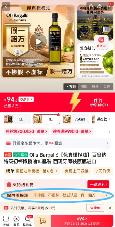 消费者登录京东APP,搜索“食用油假一赔万”可获取相关信息。
