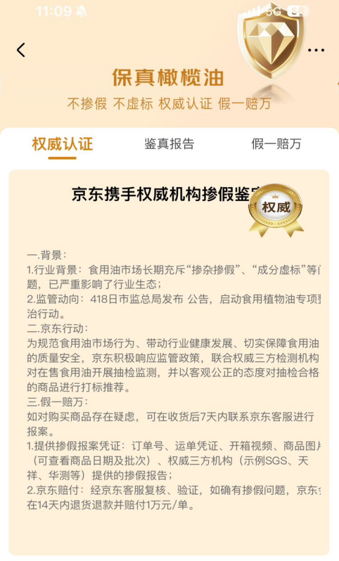 据介绍,消费者在收货后7日内,若对所购食用油存在掺假疑虑,可以第一时间联系京东客服,提交包括订单号、运单凭证、完整开箱视频、含日期及批次信息的商品图片,以及华测权威第三方机构出具的掺假检测报告。