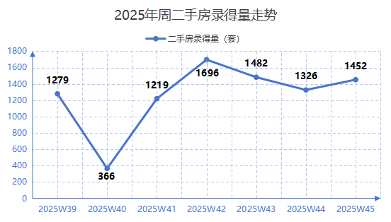 经深圳市房地产中介协会统计,2025年第45周全市二手房(含自助)录得1,452套,环比增长9.5%,近期二手房市场保持在高位震荡运行。从需求端看,本周市场新增需求量增加,环比增长4.6%。从供应端看,业主新增放盘意愿有所下降,新增委卖合同量环比下降2.5%。