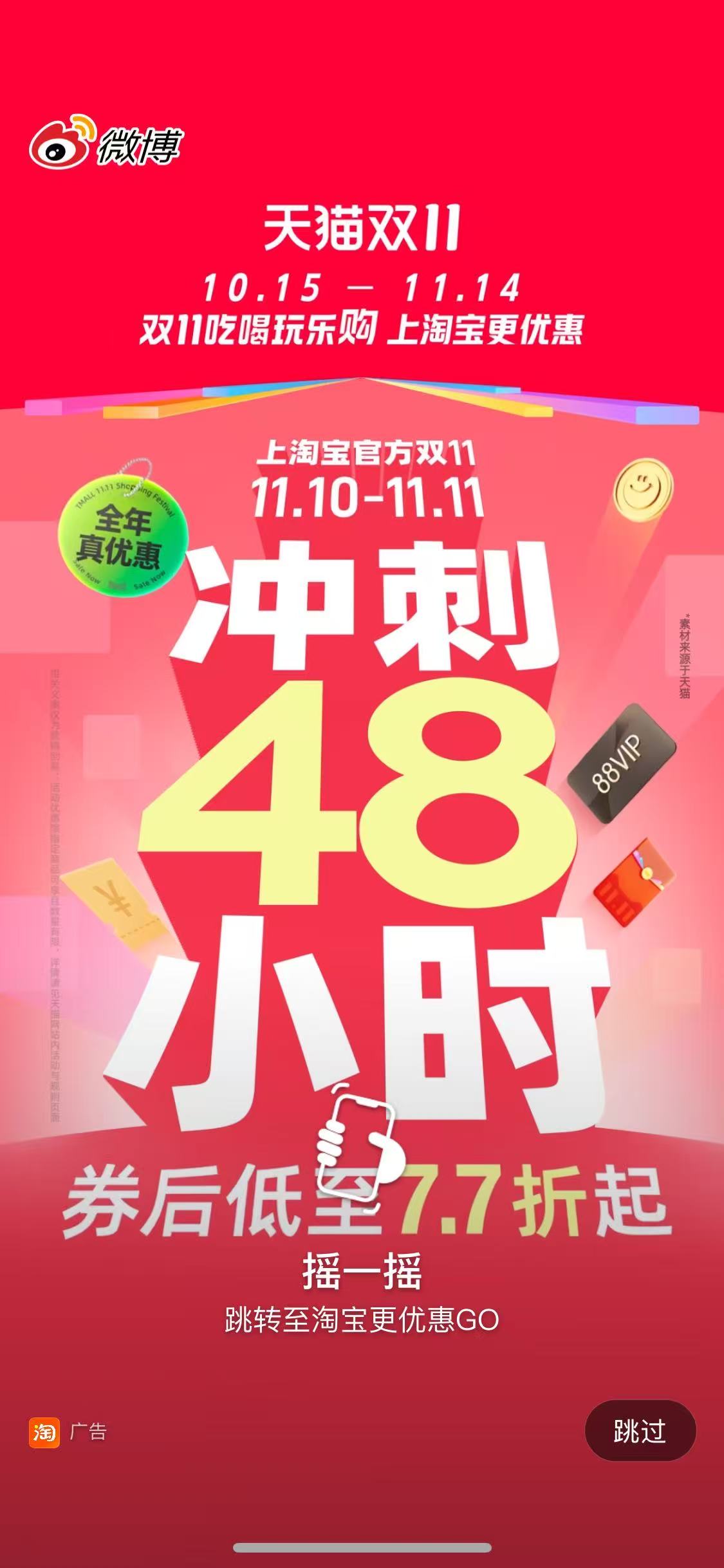 记者点开新浪微博,如投诉用户所言,稍一摇晃就跳转至天猫双11的会场界面。同样,点开闲鱼APP、百度APP,机身晃动也会直接跳转到淘宝双11购物页面。不过,其中闲鱼前身为“淘宝二手”,是阿里巴巴旗下闲置交易平台。