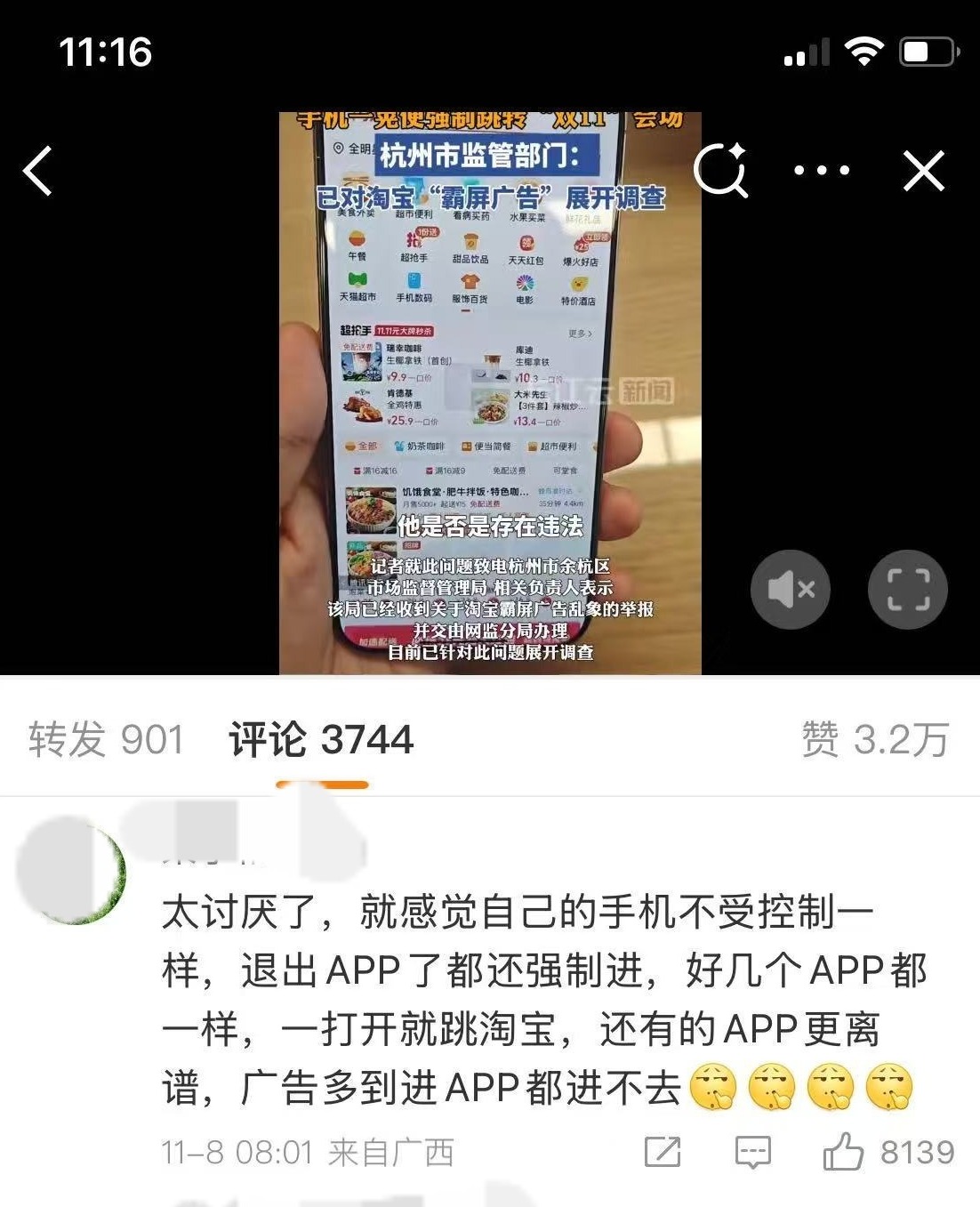 11月6日,针对淘宝“双11”期间霸屏广告乱象,该企业所在地市场监督管理局证实已收到相关举报,目前已交由网监分局展开调查。
