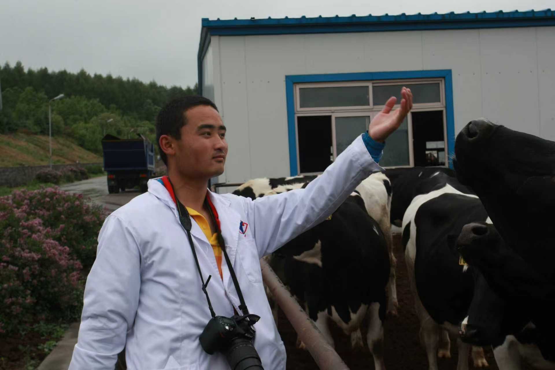 那几天,我像一块渴望水源的海绵,跟着他走进工厂、牧场,不断追问光圈与快门的奥秘。他始终耐心解答,指尖在相机按钮间轻快跳跃,将“背景要干净、主题要突出”的道理娓娓道来,还为我讲述每张照片背后的故事。更令我难忘的是,在牧场采访时,王志强老师举起相机,为我拍下了人生中第一张工作照。照片中的我身穿白色工作服,站在奶牛栏旁,手抚着奶牛,胸前的相机仿佛承载着对摄影与宣传工作的无限憧憬。