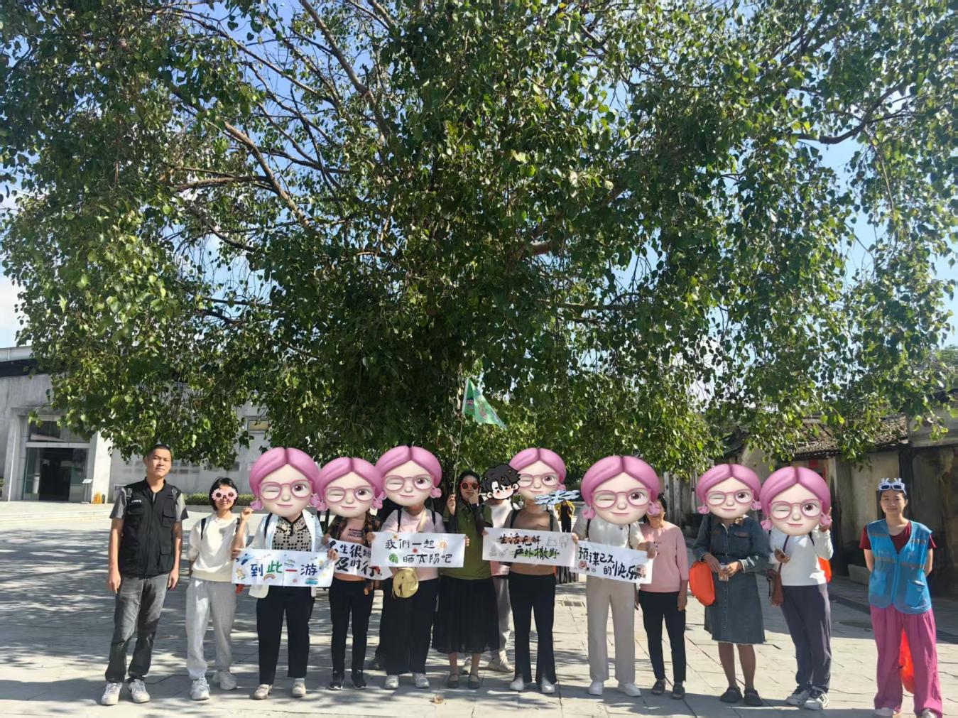 活动现场,社工通过破冰游戏,迅速拉近了参与者之间的距离。欢声笑语中,最初的拘谨之感悄然消散。徒步途中,大家尽情沐浴着温暖的阳光,畅快呼吸着清新的空气,悠然漫步于版画基地的古朴建筑与自然美景之间。社工还提前精心设置了趣味打卡点,鼓励大家使用发放的趣味眼镜、小横幅等道具合影留念,并相互交流对版画艺术的感悟。整个过程洋溢着鼓励与欢笑,许多参与者主动为同伴拍照,彼此间的支持与认可在自然的交流中悄然萌生。
