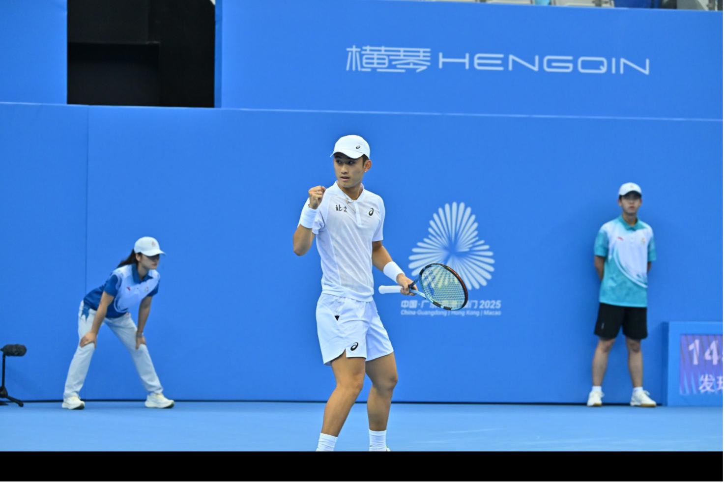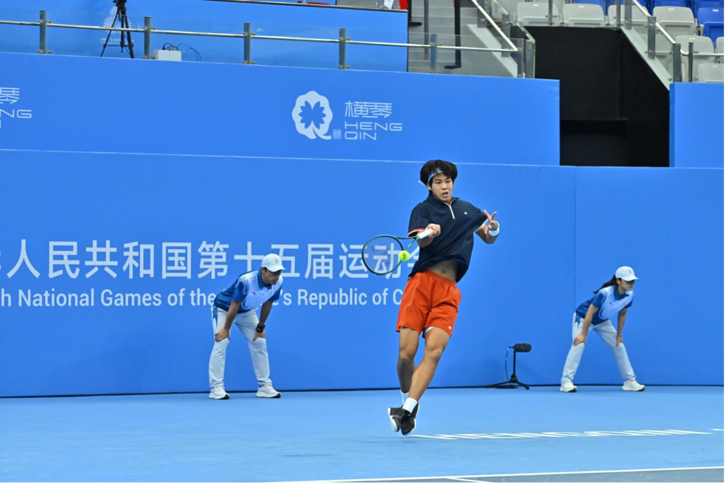 11月11日上午,十五运会网球项目在横琴国际网球中心展开男子团体半决赛的较量。乒乓球奥运冠军丁宁现身中心场观众席,观战北京队一单商竣程和广西队一单周意的比赛。最终,商竣程6:7(5)、6:1、6:0逆转获胜,帮助北京队先拔头筹。