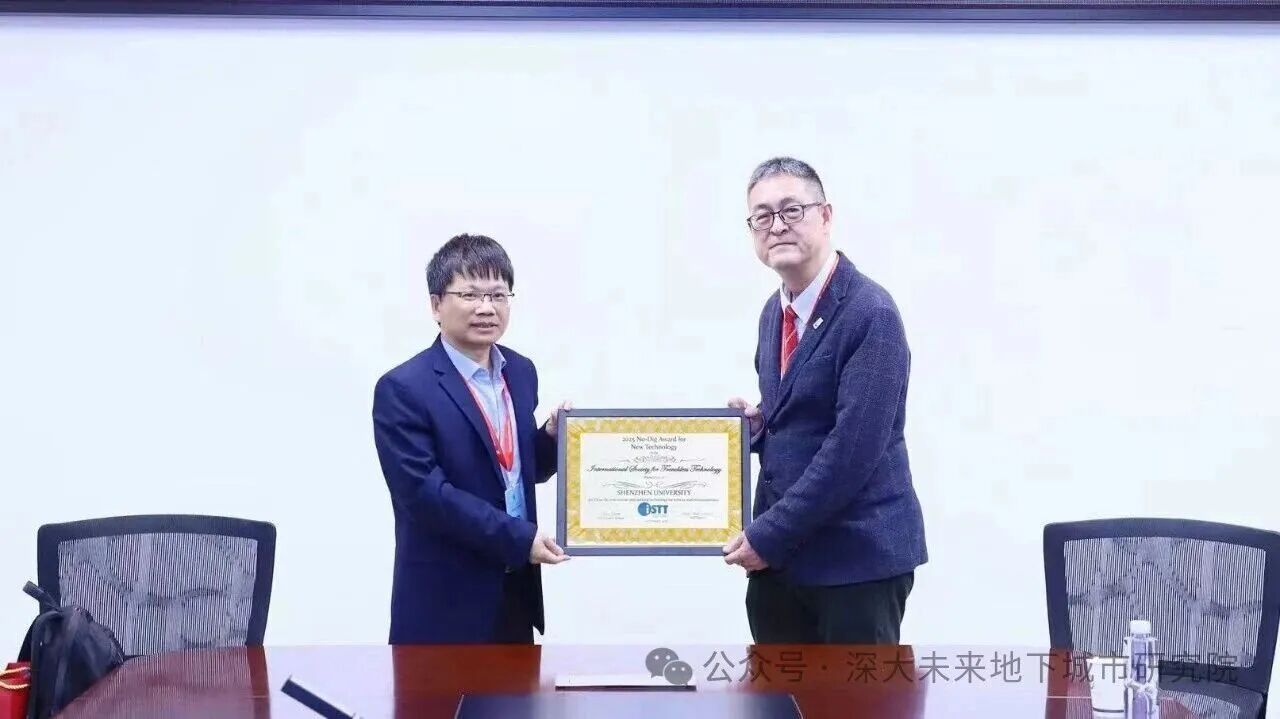 11月6日,国际非开挖技术协会主席、台湾中兴大学寿克坚教授来到深圳大学土木与交通工程学院交流,并为研发团队颁发了证书和奖杯。