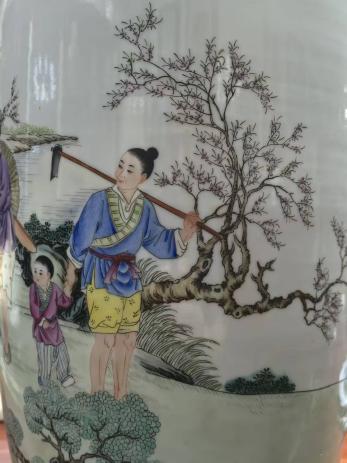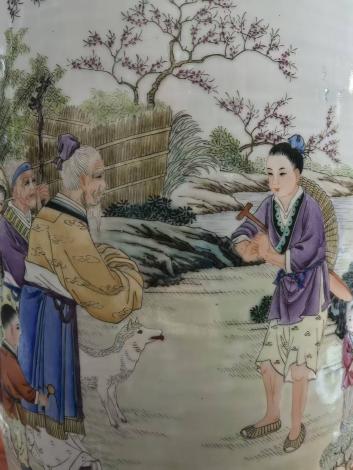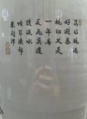 瓶呈洗口,直颈,折肩,筒腹,圈足外撇,口、肩、足部均绘锦纹、璎珞纹与回纹图案边饰,既协调了色彩关系,又增强了造型的稳重美感。腹部通景绘制《桃花源问津》图,瓶身粉料细腻润滑,呈色艳丽,为上佳粉彩料。整体构图饱满,人物、草木、山石无不笔墨秀润、清隽生动,人物衣裳与面部表情富有层次感,境物刻画工细不苟,落笔全然神气,极显形神兼备之特色。经鉴赏家万仁辉鉴定,其风格与涂菊清50年代在景德镇创作的《渔樵耕读》粉彩瓷板画高度一致,确认为涂菊清设计图稿、高级画师绘制,时代性强,存世量稀少,文人气息浓厚。