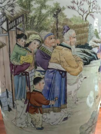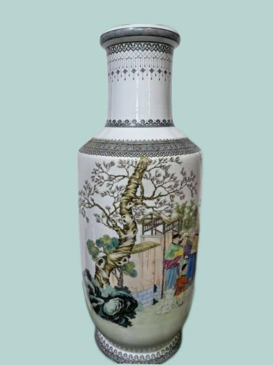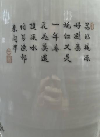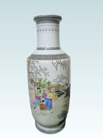 瓶呈洗口,直颈,折肩,筒腹,圈足外撇,口、肩、足部均绘锦纹、璎珞纹与回纹图案边饰,既协调了色彩关系,又增强了造型的稳重美感。腹部通景绘制《桃花源问津》图,瓶身粉料细腻润滑,呈色艳丽,为上佳粉彩料。整体构图饱满,人物、草木、山石无不笔墨秀润、清隽生动,人物衣裳与面部表情富有层次感,境物刻画工细不苟,落笔全然神气,极显形神兼备之特色。经鉴赏家万仁辉鉴定,其风格与涂菊清 50 年代在景德镇创作的《渔樵耕读》粉彩瓷板画高度一致,确认为涂菊清设计图稿、高级画师绘制,时代性强,存世量稀少,文人气息浓厚。