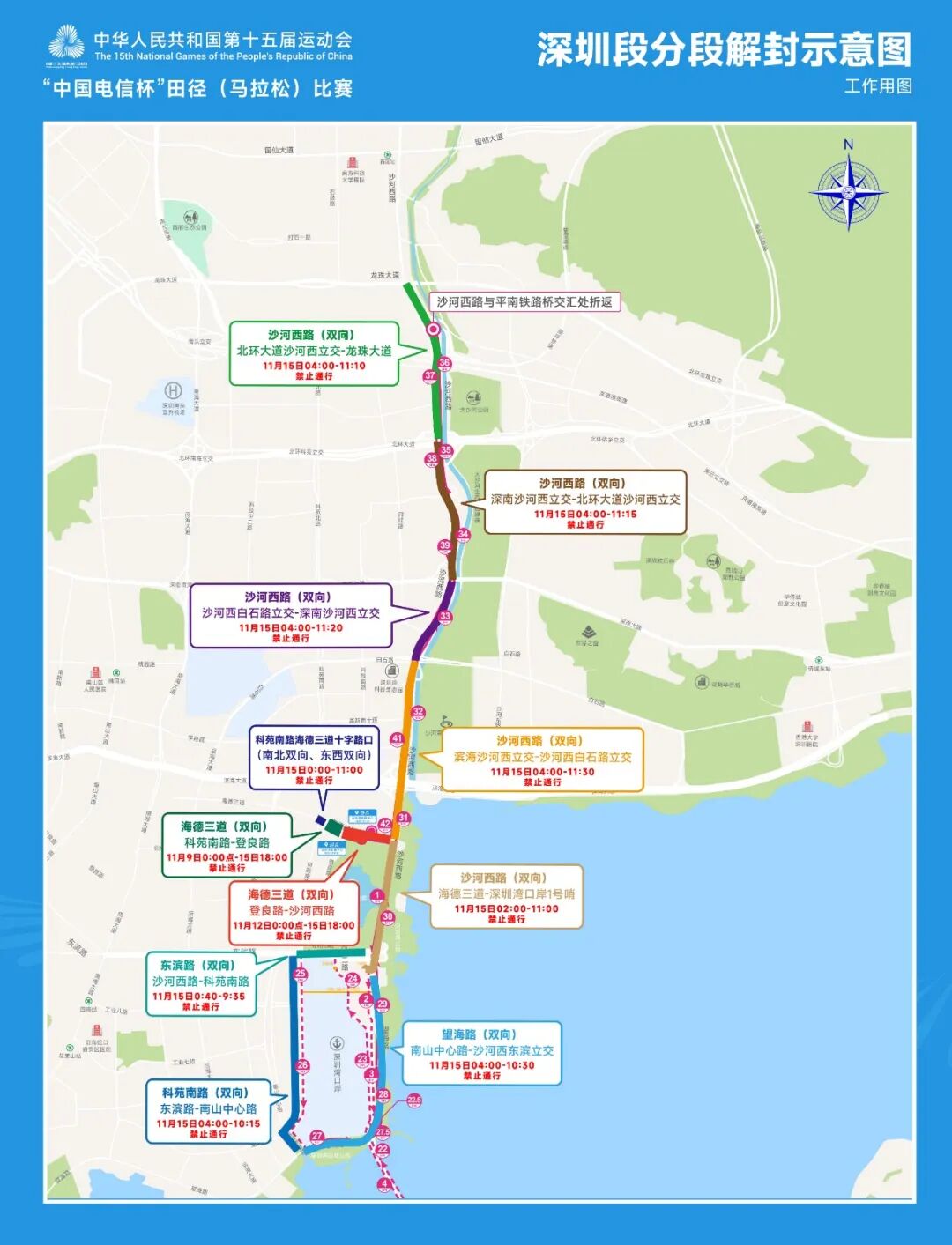(二)根据赛事路线安排,我局将于2025年11月15日0:00至比赛结束,对金湾东二路(深圳湾口岸3号哨-东滨路)、东滨路双向(沙河西路-科苑南路)、科苑南路双向(东滨路-南山中心路)、南山中心路双向(科苑南路-望海路)、望海路双向(南山中心路-沙河西东滨立交)及沙河西路双向(沙河西东滨立交-龙珠大道)的赛事路段实施封闭管制措施,并依次对沿线相关平交路口、立交桥实施流量控制,减少赛事周边道路的交通压力,而后随着比赛队伍推进,依次对赛事沿线路段、路口及立交桥逐步解除交通管制。