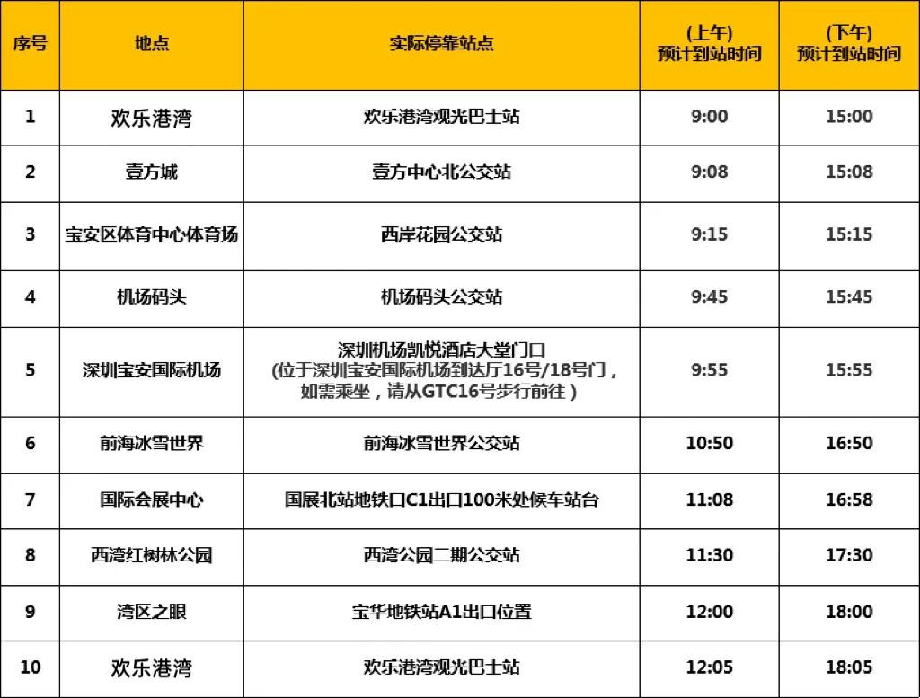 欢乐港湾→壹方城→宝安区体育中心体育场→机场码头→深圳宝安国际机场→前海冰雪世界→国际会展中心→西湾红树林公园→湾区之眼→欢乐港湾