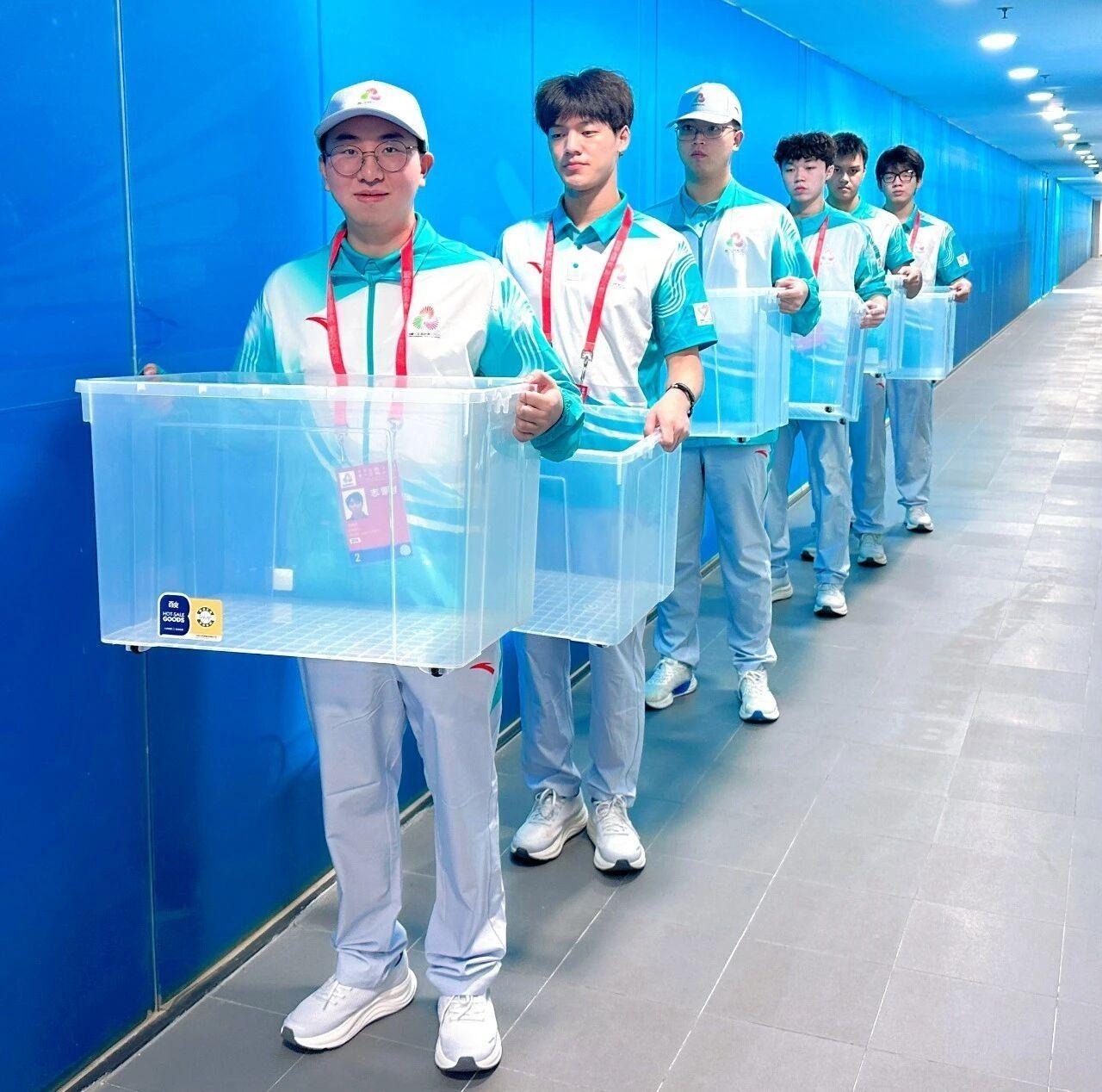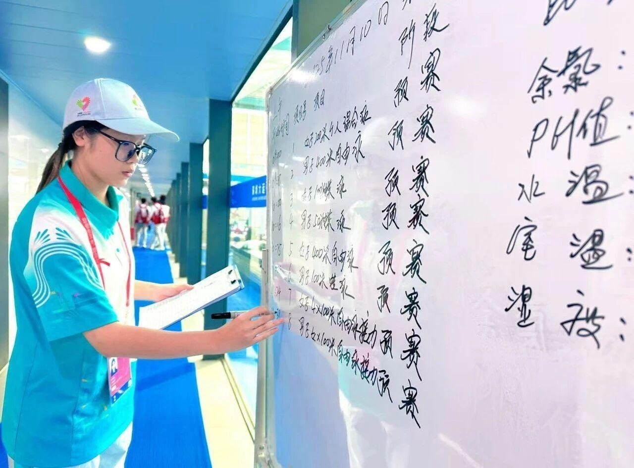 目前,自行车、门球、模型机等赛事的志愿服务已圆满收官,“小海豚”们无缝衔接,全力投入游泳、排球项目的服务工作。从赛事保障、物资分发到接待咨询、医疗协助,他们在各自岗位上履职尽责,用细致入微的服务赢得了参赛人员、赛事组织方的一致认可。在这场体育盛会中,“小海豚”们不仅是赛事顺畅运转的“螺丝钉”,更在服务中收获成长,绽放属于青年学子的高光时刻。