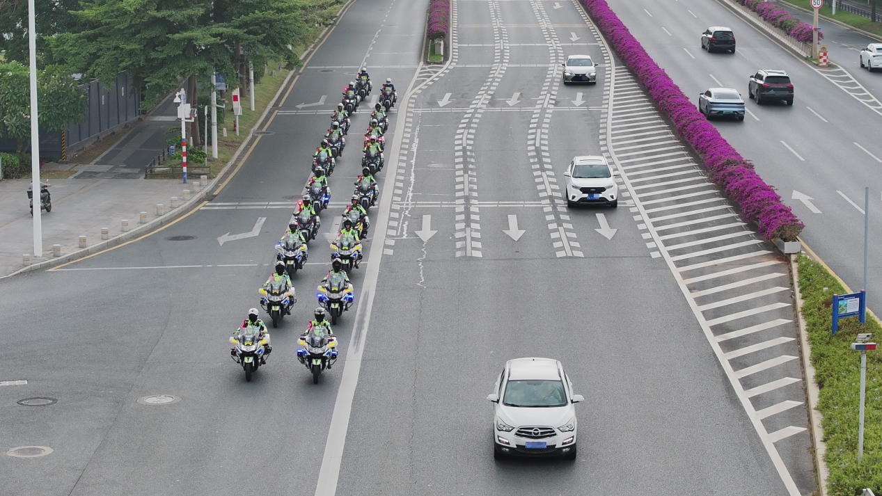动员结束后,实战行动即刻展开。铁骑警力兵分三路,一方面前往JX行动链路整治点,针对违法停车、占道行驶、超速等影响通行秩序的突出违法行为开展集中整治,通过精准查处、严格执法,营造“违法必查、查则必究”的严管氛围;另一方面,铁骑队员化身路面“移动卫士”,围绕核心场馆周边道路、赛事接驳路线及辖区主次干道开展全覆盖巡逻防控。巡逻中,队员们灵活调整巡逻频次与路线,重点排查道路安全隐患,及时疏导拥堵路段,为过往车辆和行人提供咨询引导,同时兼顾赛事相关车辆的优先通行保障与市民日常出行需求,用穿梭不息的荧光绿身影,织密立体防控网络,以实际行动守护道路畅通与群众安全,彰显光明交警护航十五运的坚定决心与务实担当。