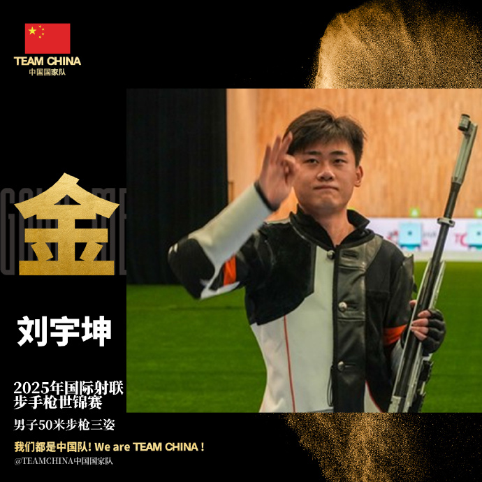 北京时间11月11日,2025国际射联步手枪世锦赛,恭喜刘宇坤夺得男子50米步枪三姿冠军!