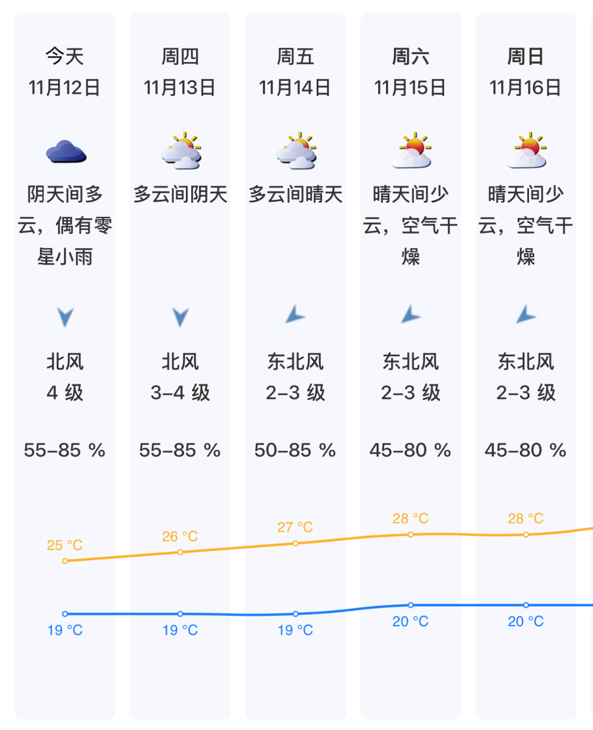 受冷空气和台风“凤凰”外围环流的共同影响,12日将是风力最显著的一天。天气以阴天间多云为主,局地偶有零星小雨,气温在19-25℃之间。特别需要注意的是,夜间偏北风最大阵风可达8-9级,白天风力会逐渐减弱。市民前往沿海、高地需做好防风措施。