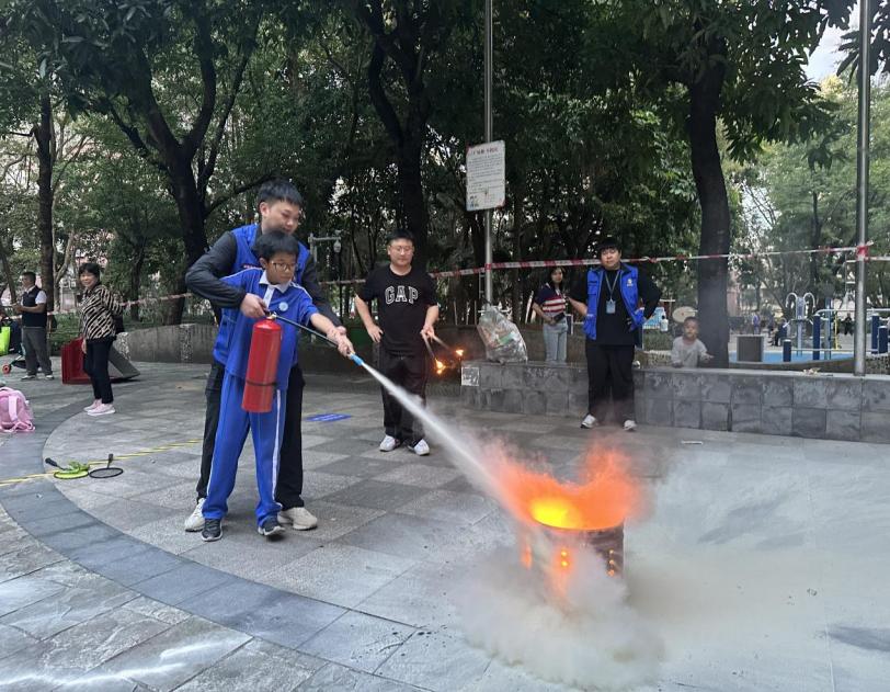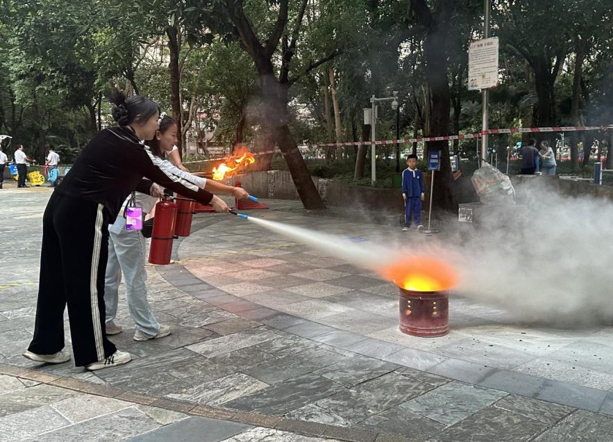 另一边的“灭火器实操体验”更是让居民们过了一把“消防员”的瘾。在消防宣传员的指导下,大家轮流上阵,学习如何正确判断风向、拔掉保险销、对准火焰根部喷射。“提拔握压”的口诀通过亲身体验深入人心。一位刚体验完的王同学兴奋地说:“以前学校演练只能看消防员叔叔使用灭火器,今天能自己动手操作了一遍,真的太好玩了!”