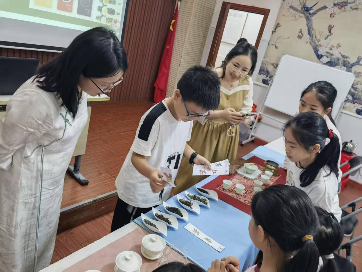 活动特别邀请龙华区职业技术学校茶艺老师授课。活动现场,茶艺师以“茶之初印象”为引,通过实物观察与故事讲述,带领孩子们初探茶文化脉络。在“六茶大侦探”环节,孩子们化身品茶人,通过触觉辨识干茶形态、嗅觉联想茶香类型、味觉对比汤色差异,系统掌握绿茶的“清汤绿叶”、红茶的“红汤红叶”等核心特征,直观感受六大茶类的地理分布与工艺差异。