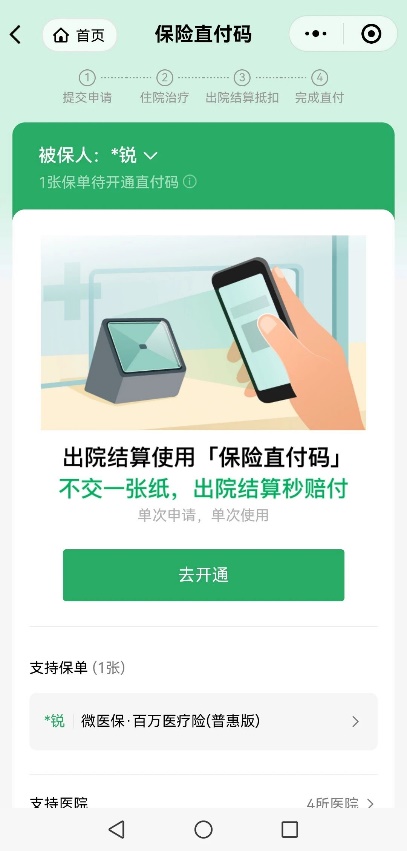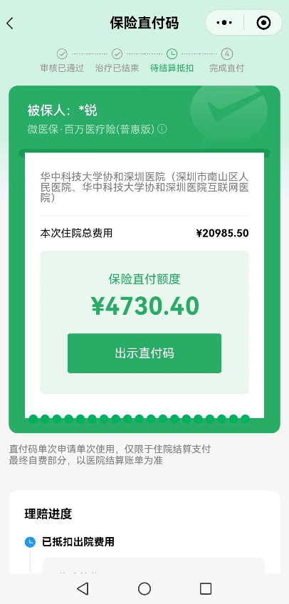 举例来说,李叔叔住院花了20,000元,医保报销12,000元,以前,李叔叔在出院时需要先自费支付8,000元,而后再向保险公司申请理赔。“商保直付”服务上线后,保险公司在李叔叔办理出院结算前,已事先通过医疗数据共享完成自动核赔,李叔叔出院结算时,展示微信支付界面的保险直付码,即可在医保同步结算后,保险公司直接支付自费部分费用,无需本人先自费、再报销。