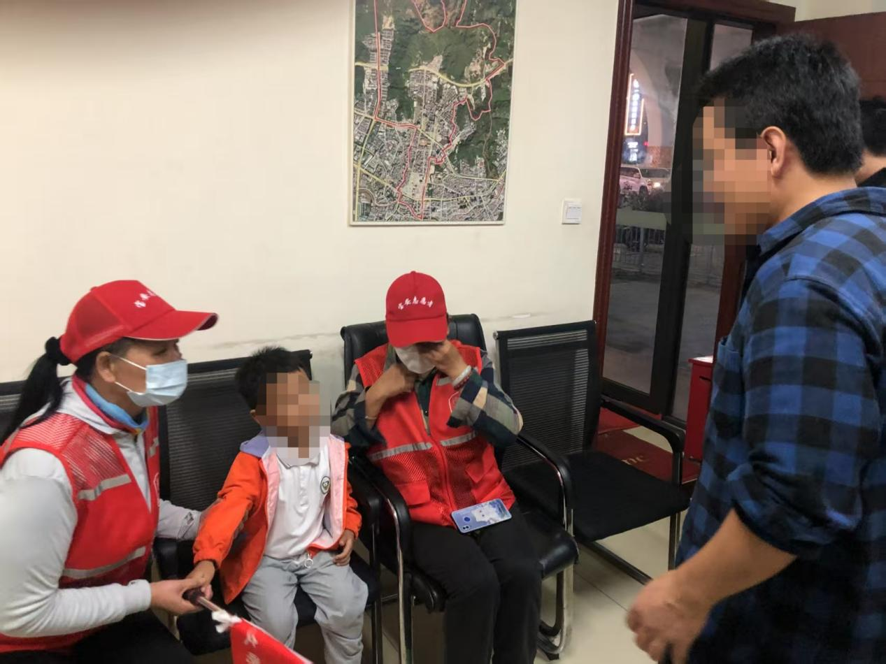得知情况后,陈瑞妹、陈桂兰第一时间安抚孩子情绪,蹲下身耐心引导其回忆家长信息。