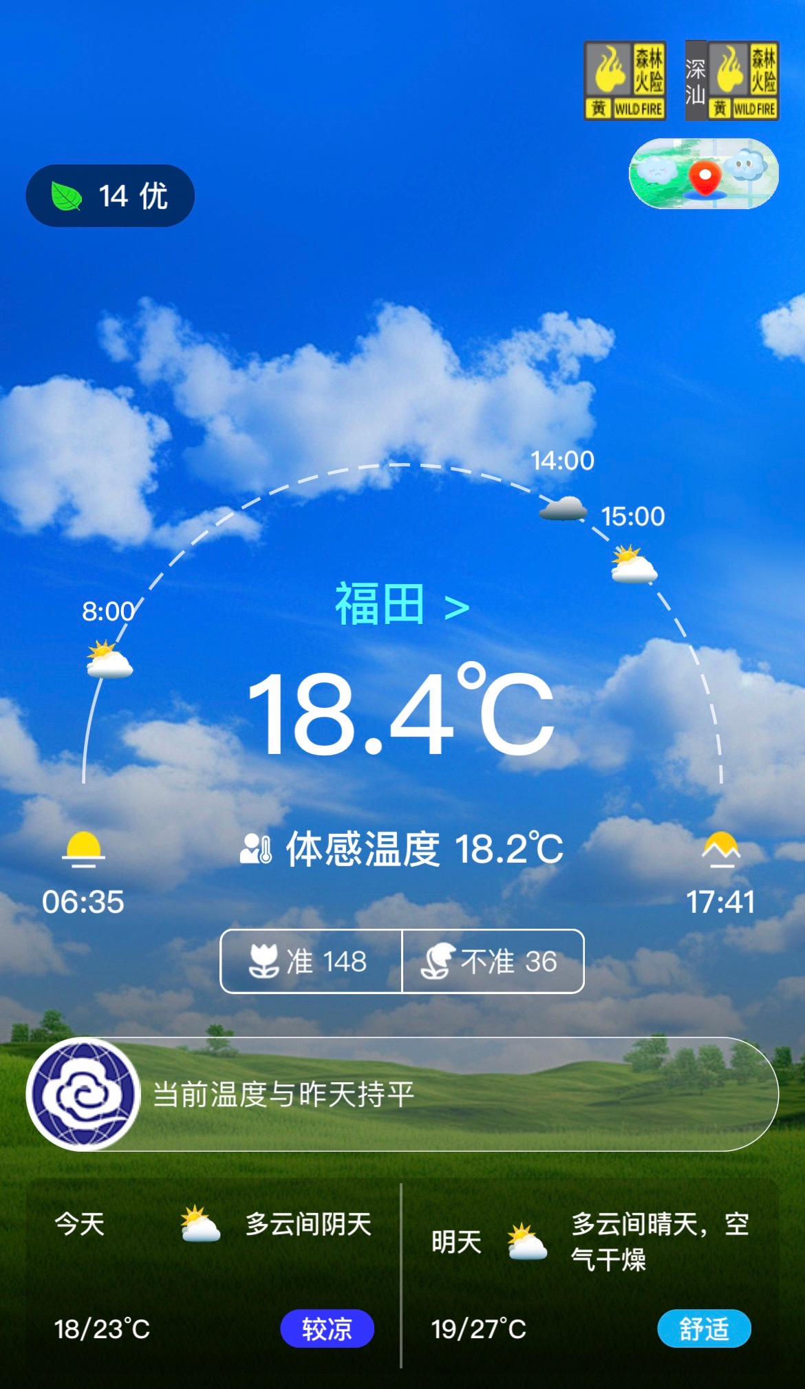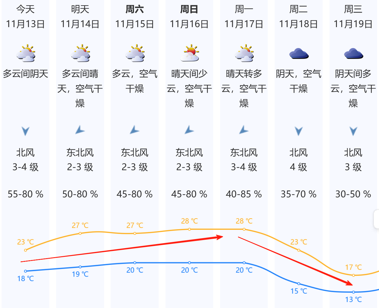 14-17日,深圳多云到晴天,空气干燥,气温逐日缓慢回升。