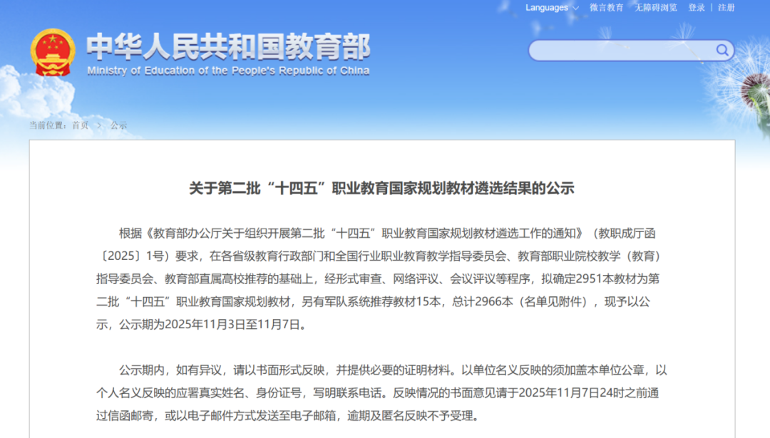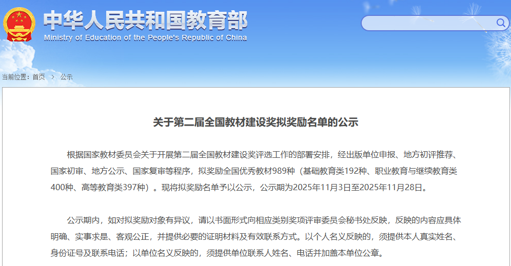全国教材建设奖由国家教材委员会主办、教育部承办,于2020年设立,每四年评选一次,覆盖基础教育、职业教育与高等教育各领域,是我国教材建设领域的专项奖项。本届评选经市级推荐、省级遴选、国家评审与公示等程序,最终评出全国优秀教材、全国教材建设先进集体和先进个人三类奖项。
