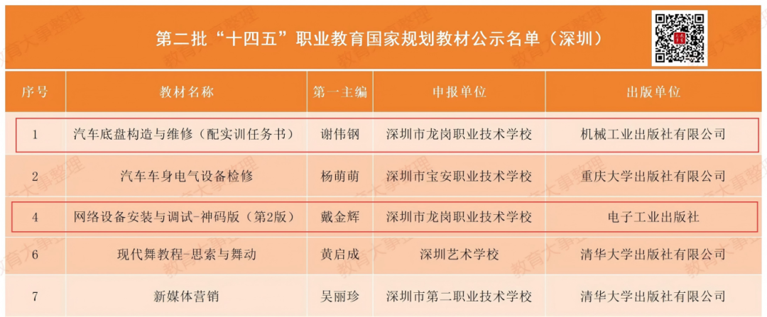 在同期公布的第二批“十四五”职业教育国家规划教材名单中,深圳市共有38部教材入选,其中中职类教材5部,龙岗职业技术学校占2席。