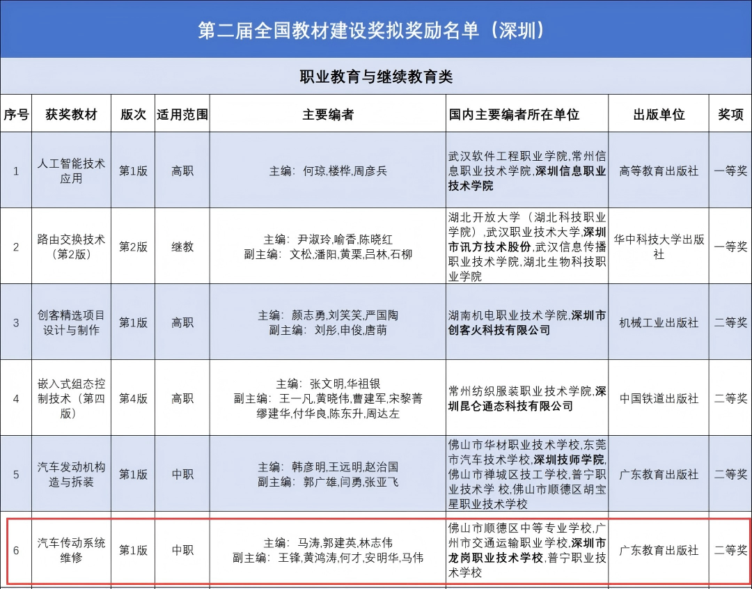 11月3日,教育部公布第二届全国教材建设奖及“十四五”职业教育国家规划教材遴选结果,龙岗职业技术学校参与编写的三部教材入选。其中,汽车专业部部长王锋作为副主编参编的《汽车传动系统维修》(第1版),获全国教材建设奖职业教育与继续教育类优秀教材二等奖;谢伟钢老师编写的《汽车底盘构造与维修》(配实训任务书)、计算机部部长戴金辉编写的《网络设备安装与调试——神码版(第2版)》入选第二批“十四五”职业教育国家规划教材。