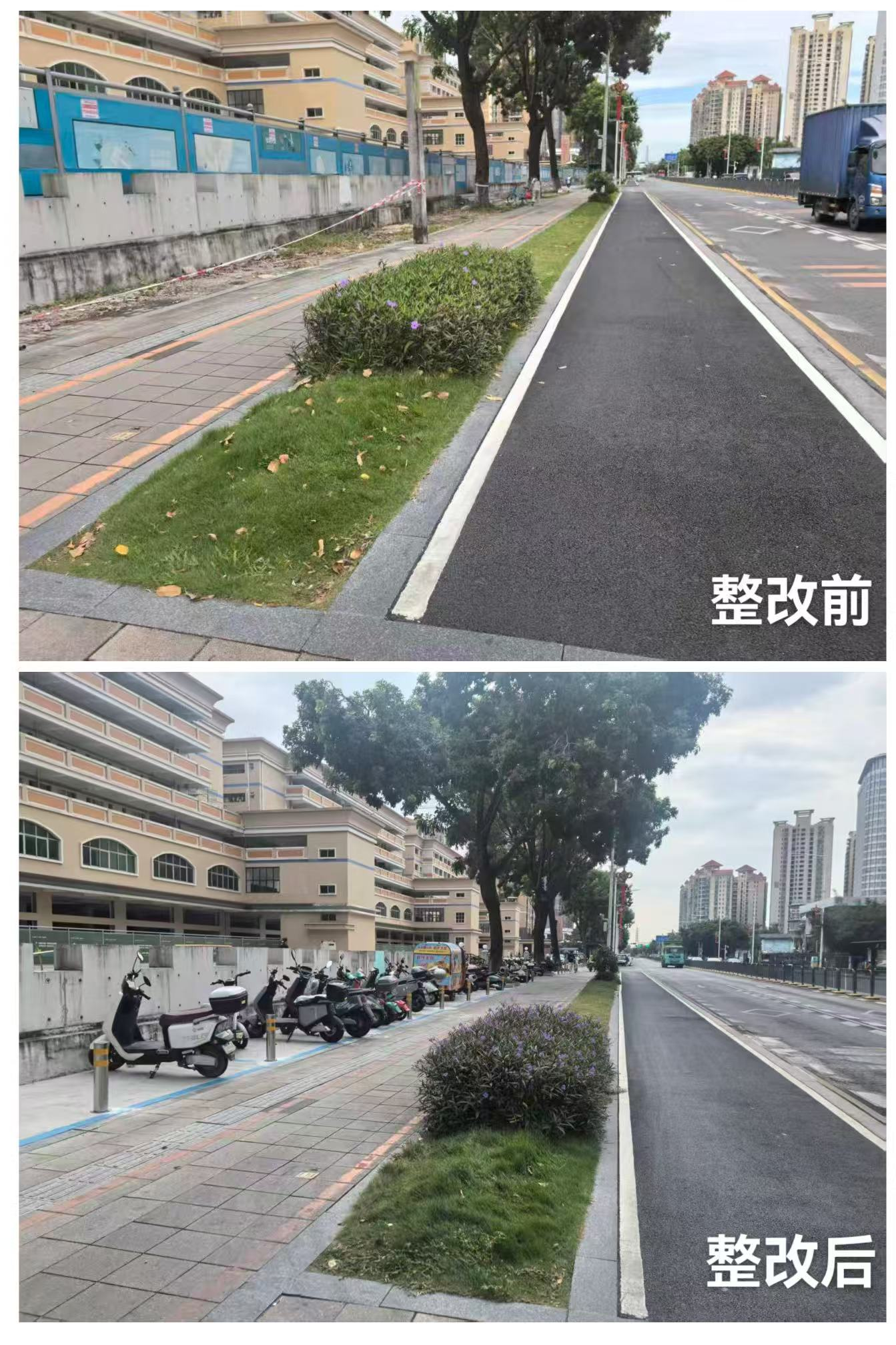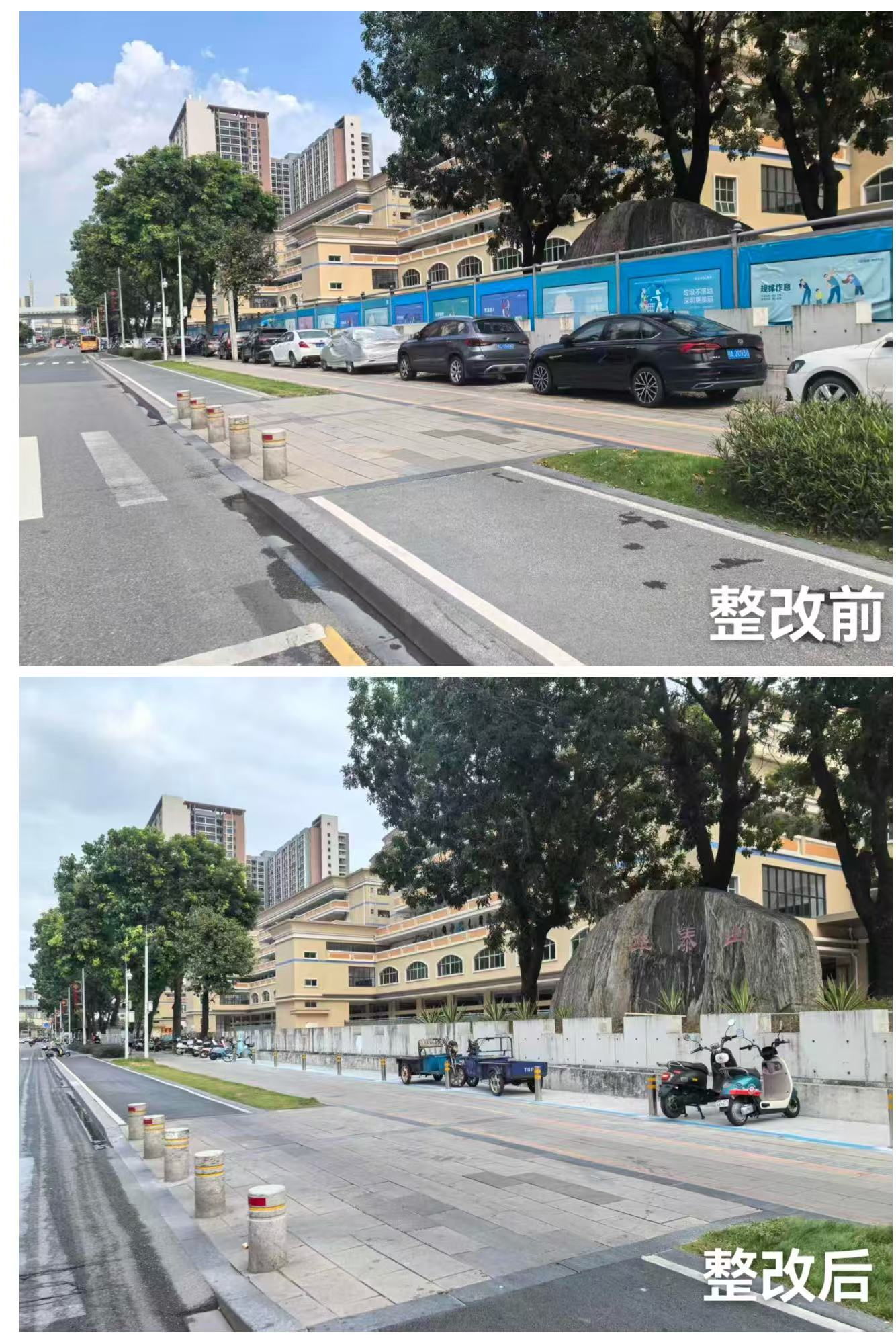 此外,针对安托山工业园北门围墙外机动车违规停放、影响通行与市容的问题,社区党委积极协调城管、交安委及园区物业开展联合整治,累计清理违停车辆100余车次。并由安托山集团出资公益硬化路面649平方米,社区整合民生微实事资金硬化624平方米,通过整体规划,将硬化区域合理设置为非机动车停放区,并实施“三区分离”管理,明确划分非机动车、共享单车停放区及行人通行区,新增停车位约500个,有效改善该区域秩序与环境。