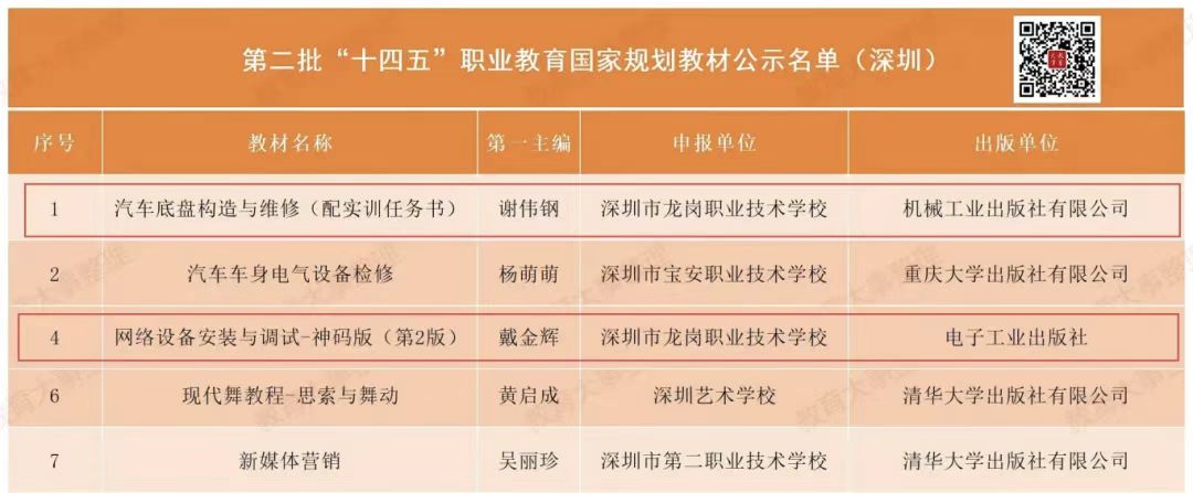 值得一提的是,在第二批“十四五”职业教育国家规划教材遴选中,深圳市成功立项教材38部,中职学校仅有5部,而龙岗职校独占两席,拟立项数居全市中职学校首位。