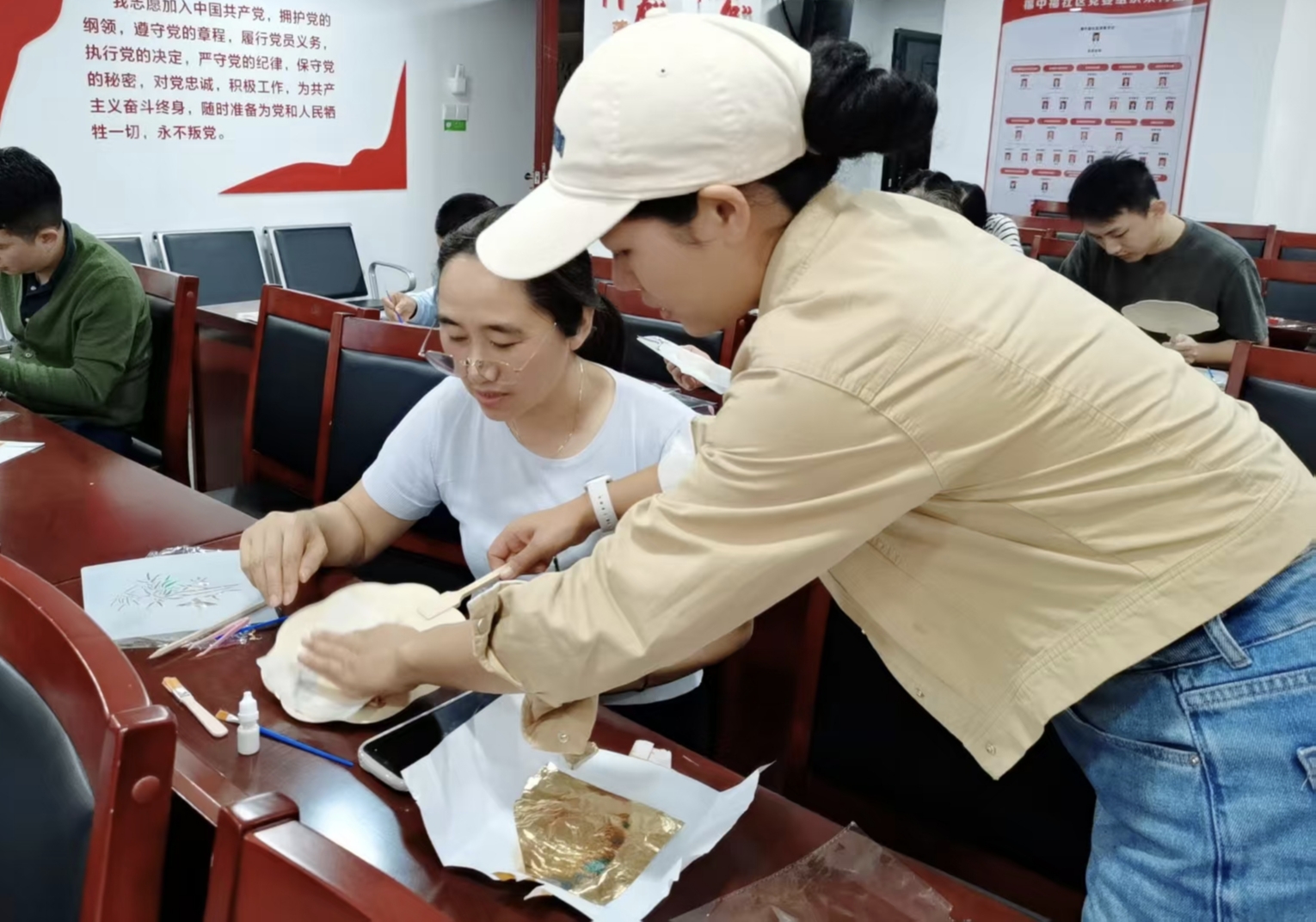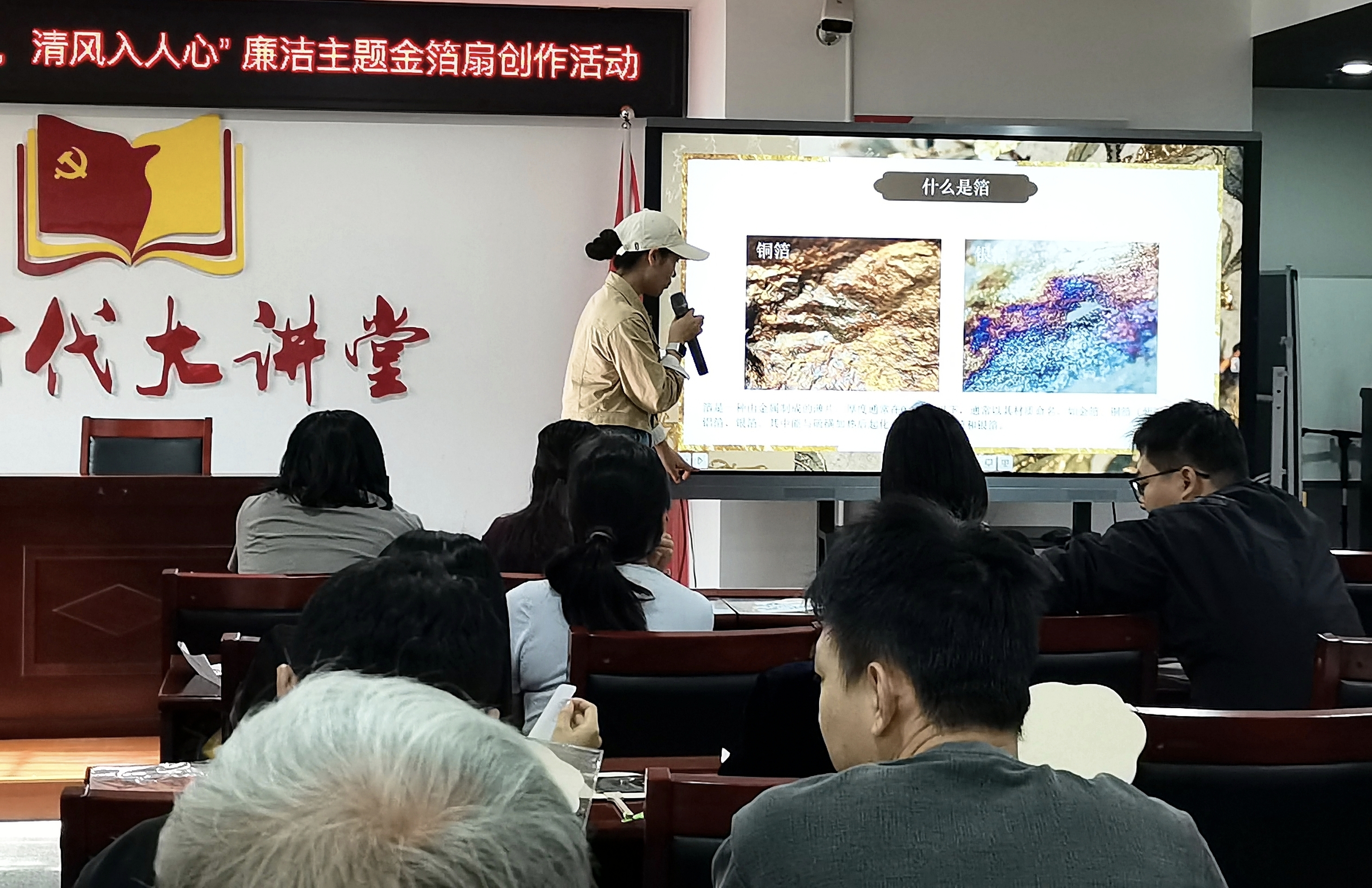 随后,工作人员详细讲解金箔扇的历史渊源、文化寓意及制作工艺,针对金箔粘贴等关键环节进行现场示范,确保居民掌握制作要领。在创作环节,参与者精心制作寓意廉洁的作品:有的以“莲花”为主题,诠释“出淤泥而不染”的高洁品格;有的绘制山水、竹兰等图案,寄寓廉洁情怀。熠熠生辉的金箔与深刻寓意相得益彰,既承载传统文化底蕴,又传递着对廉洁精神的坚守。