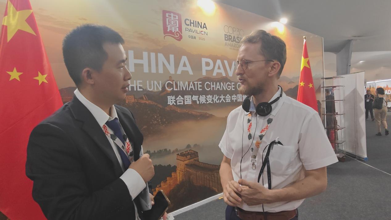 南方电网深圳供电局代表在会场与外籍人士交流绿电绿证实践经验。(郑诚然 摄)