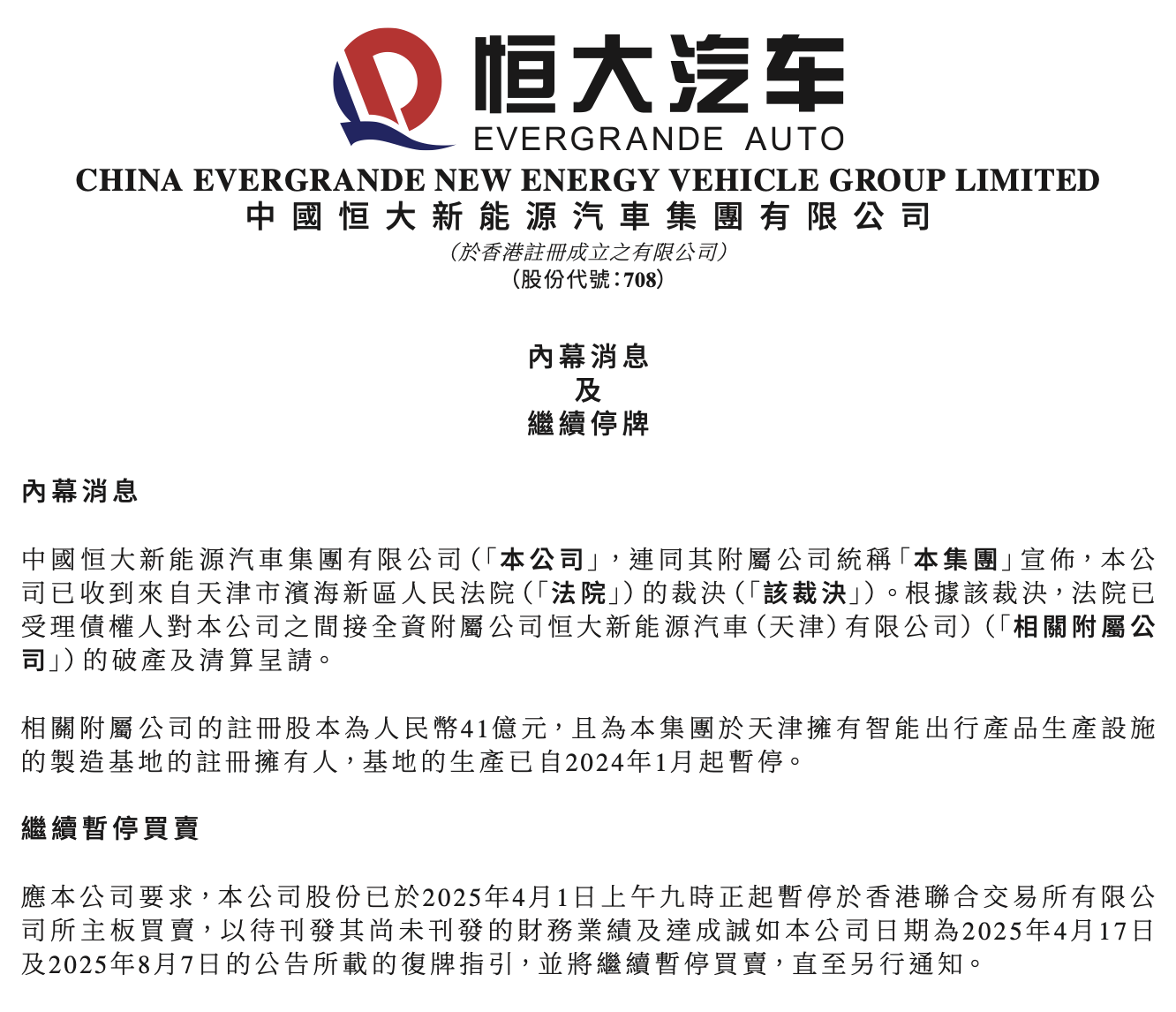 11月13日,恒大汽车(00708.HK)在港交所公告,公司已收到来自天津市滨海新区人民法院的裁决。根据该裁决,法院已受理债权人对公司之间接全资附属公司恒大新能源汽车(天津)有限公司的破产及清算呈请。