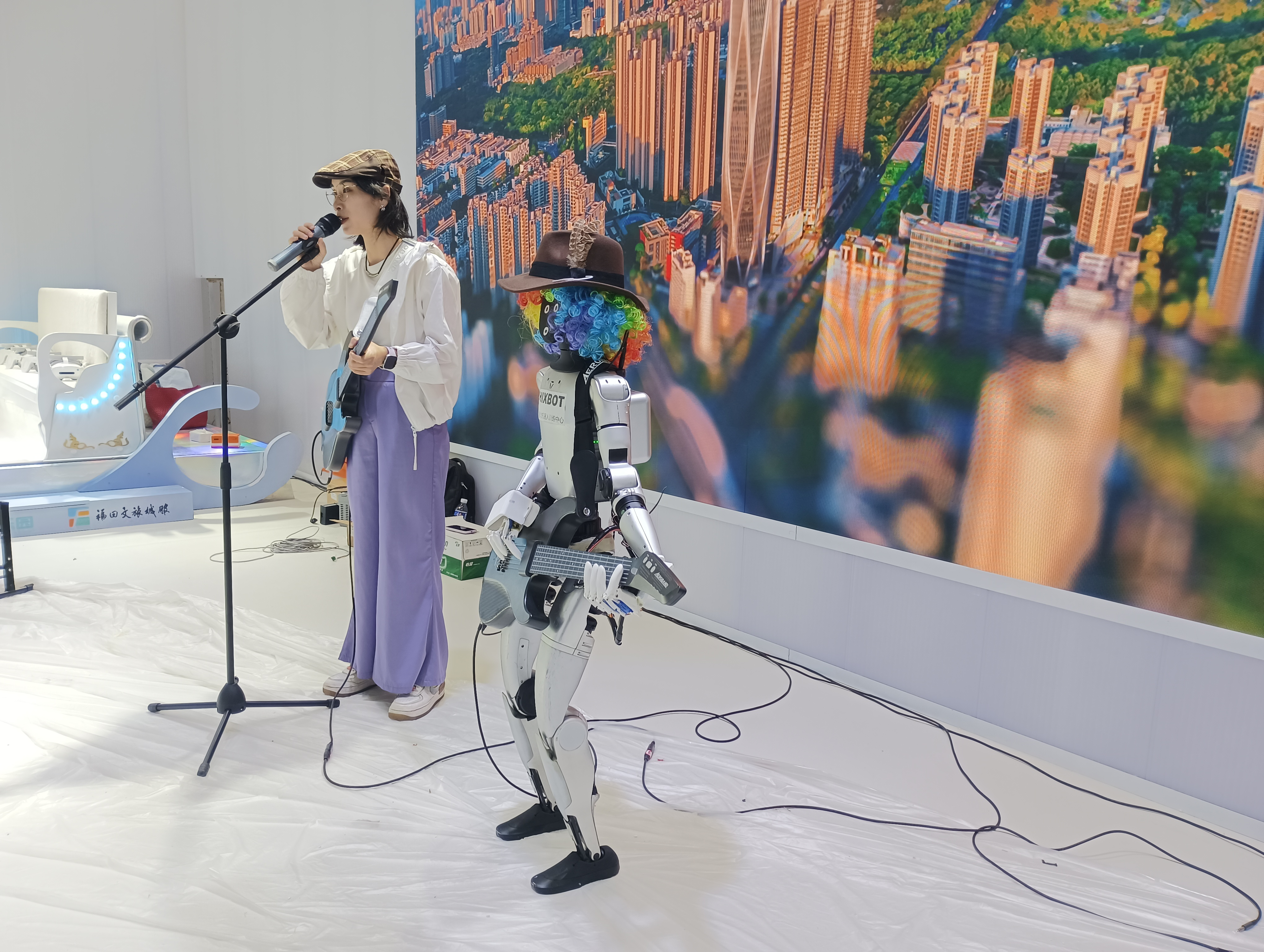 作为东道主的深圳集中亮相了“20+8”产业方阵的核心成果,搭配沉浸式互动设计,让科创之城的体验更直观深刻。其中,河套展位上,一位女歌手正与打扮时尚的机器人吉他手演奏歌曲,吸引了众多围观者。