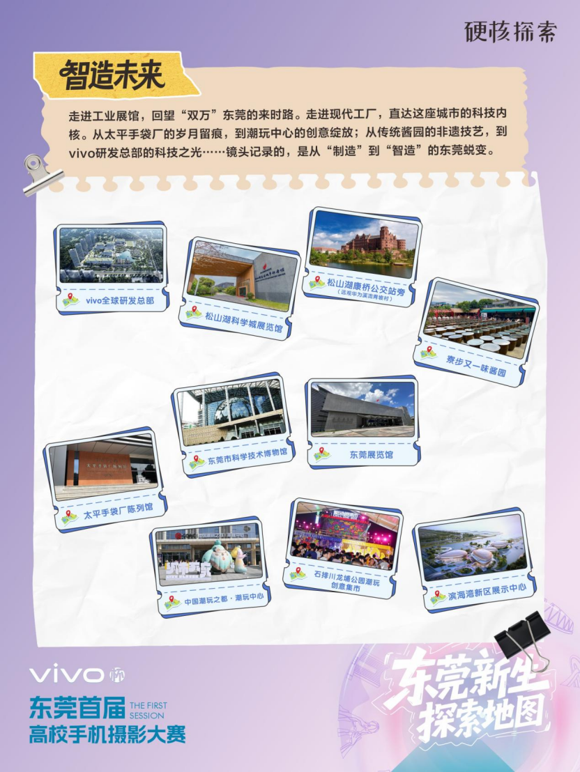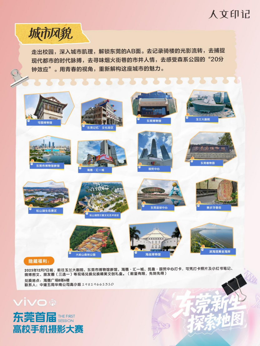 目前,vivo杯“初见东莞·光影新生”高校手机摄影大赛正面向10所在莞高校征集作品,作品主题涵盖“校园生活”“城市风貌”“智造未来”,征集期将持续至12月。优秀作品将通过专家评审与网络投票双重筛选,最终举办专题展览。