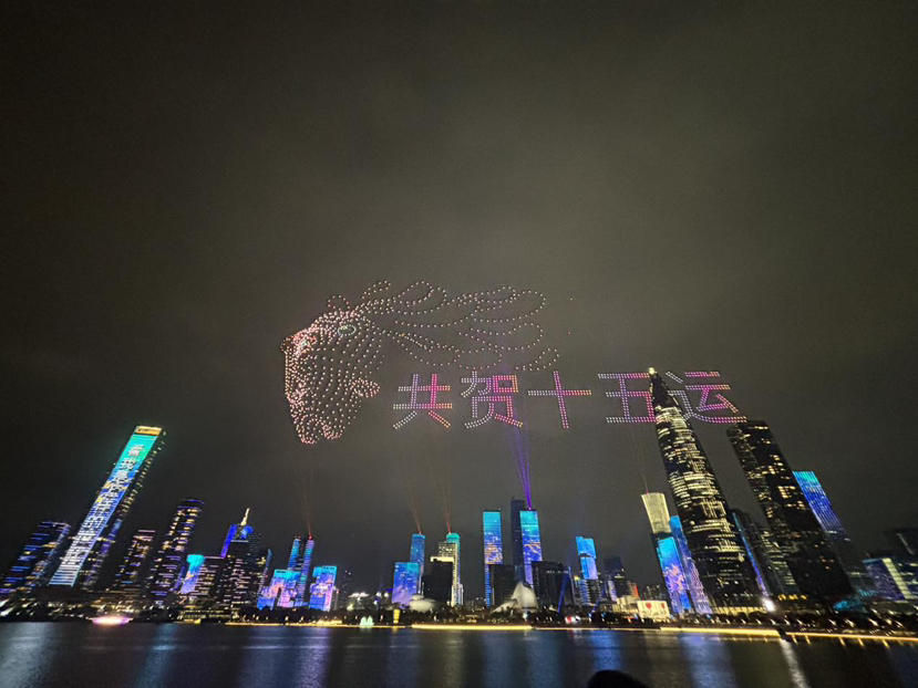 星河垂曜,光影跃动。随着夜空中升起“深圳光影艺术季”的天幕大秀,星光点点与无人机编队交相辉映,无人机灯光秀以流动的光影讲述城市故事,点亮了整个深圳湾的夜空。