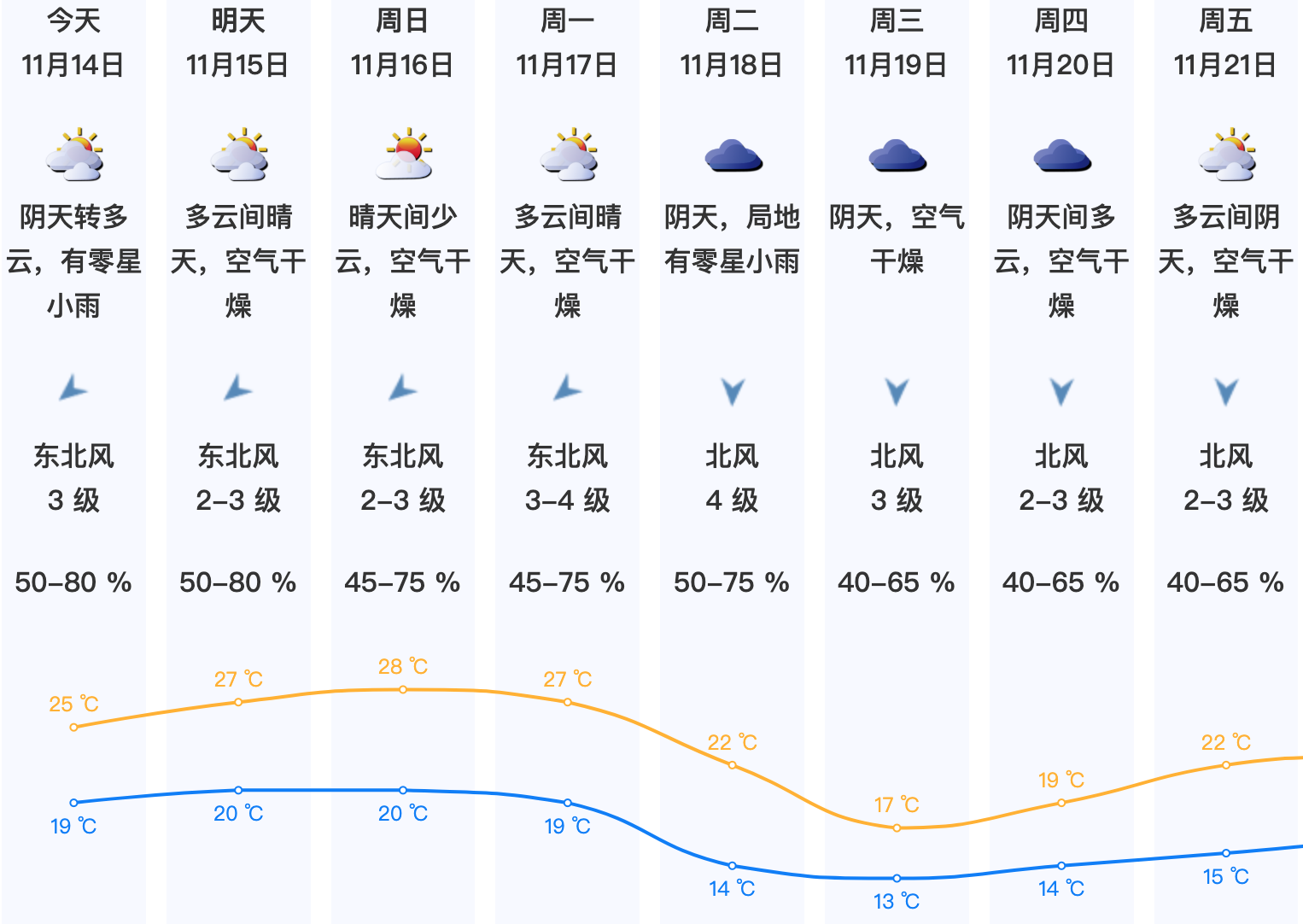 14-16日,全省大部晴到多云。最低气温:粤北大部、肇庆和云浮北部市县14~16℃,南部沿海市县19~21℃,其余市县17~18℃。