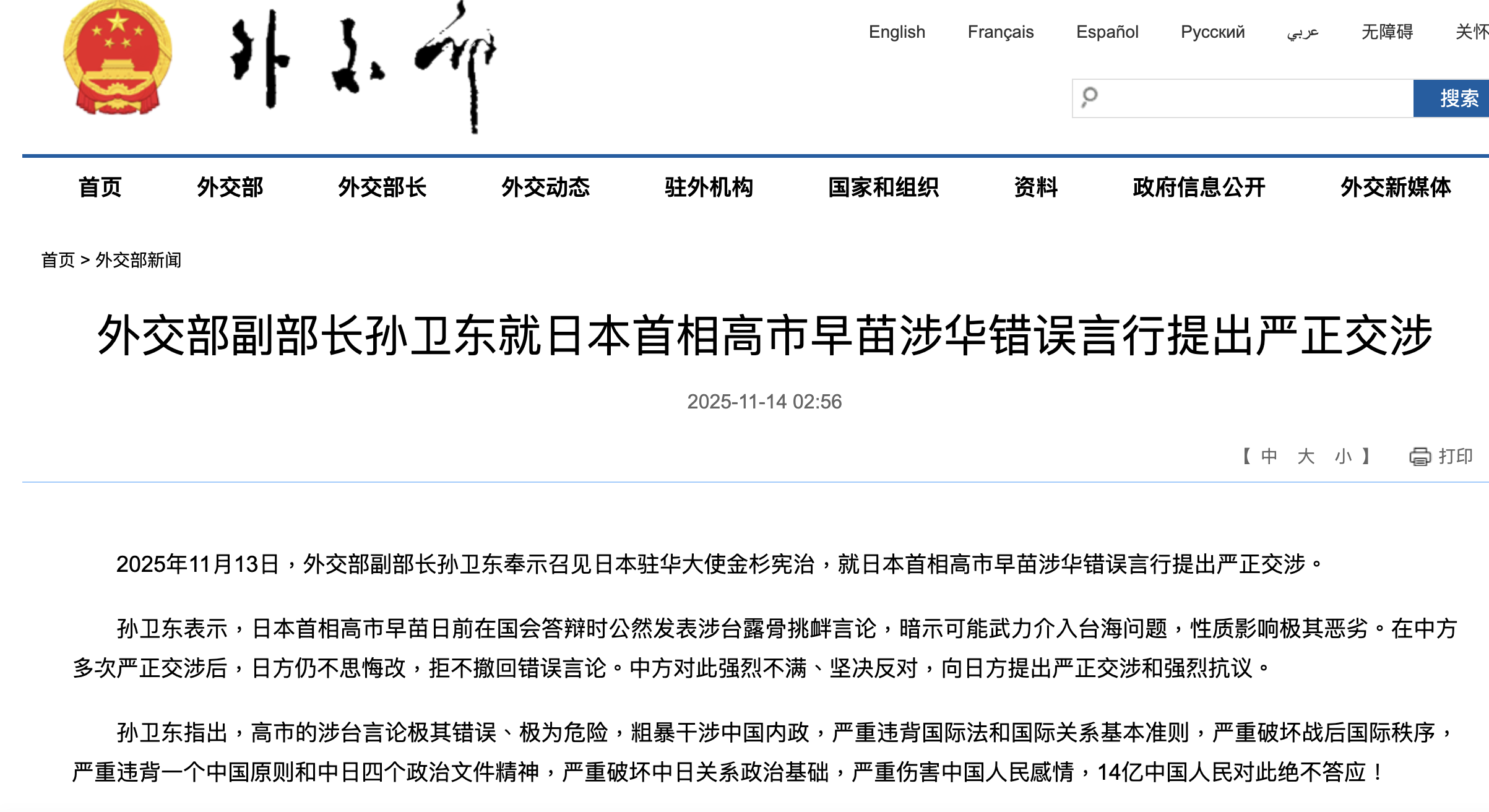 2025年11月13日,外交部副部长孙卫东奉示召见日本驻华大使金杉宪治,就日本首相高市早苗涉华错误言行提出严正交涉。