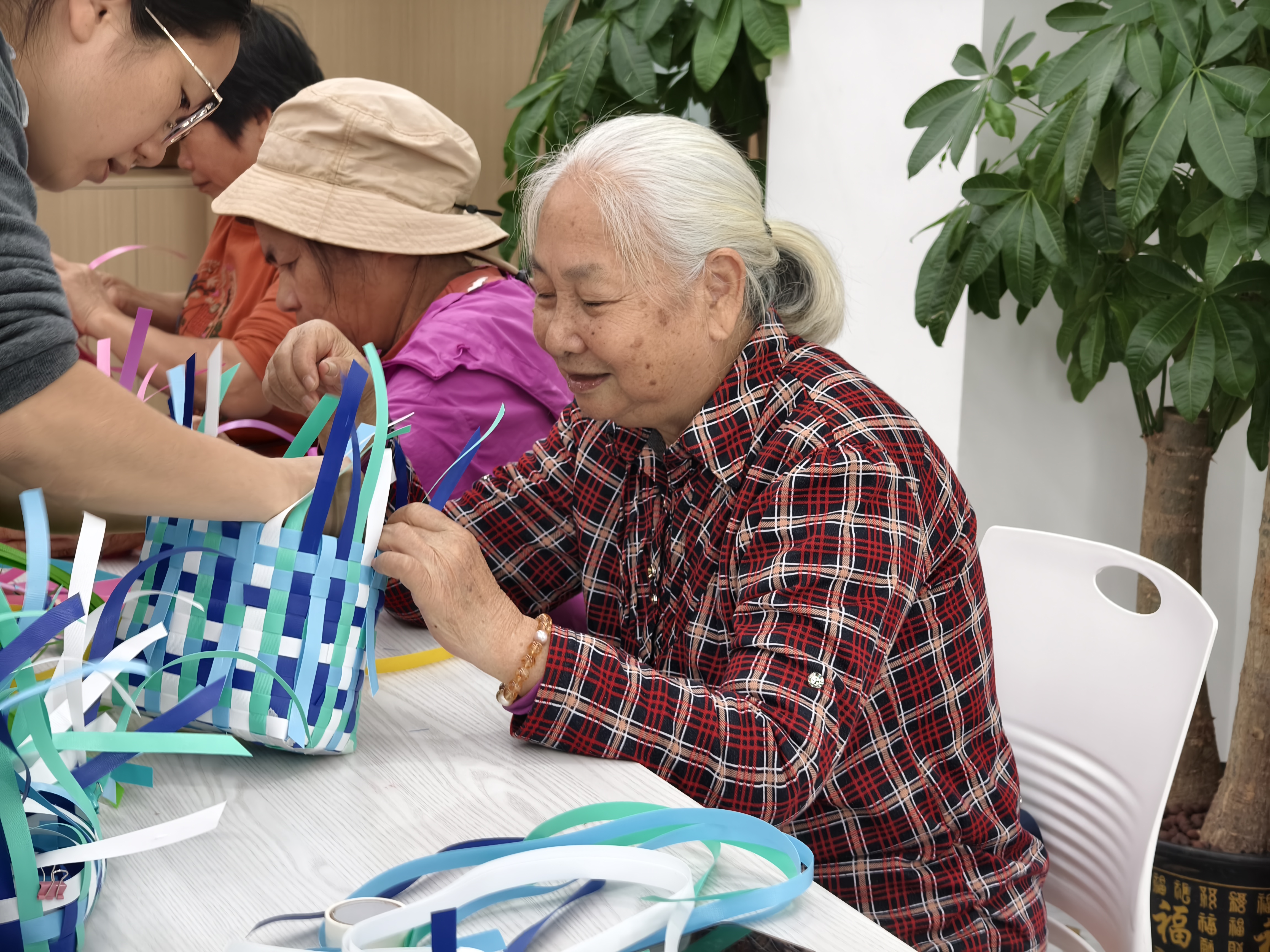 在实践环节,长者跟随老师的步骤,体验起底、编织、锁口等传统工序。看似简单的藤条在指尖穿梭交错,逐渐显现出篮子的雏形。现场气氛专注而热烈,每一步制作都是与古老智慧的一次对话,每一件渐成的作品都凝聚着耐心与匠心。