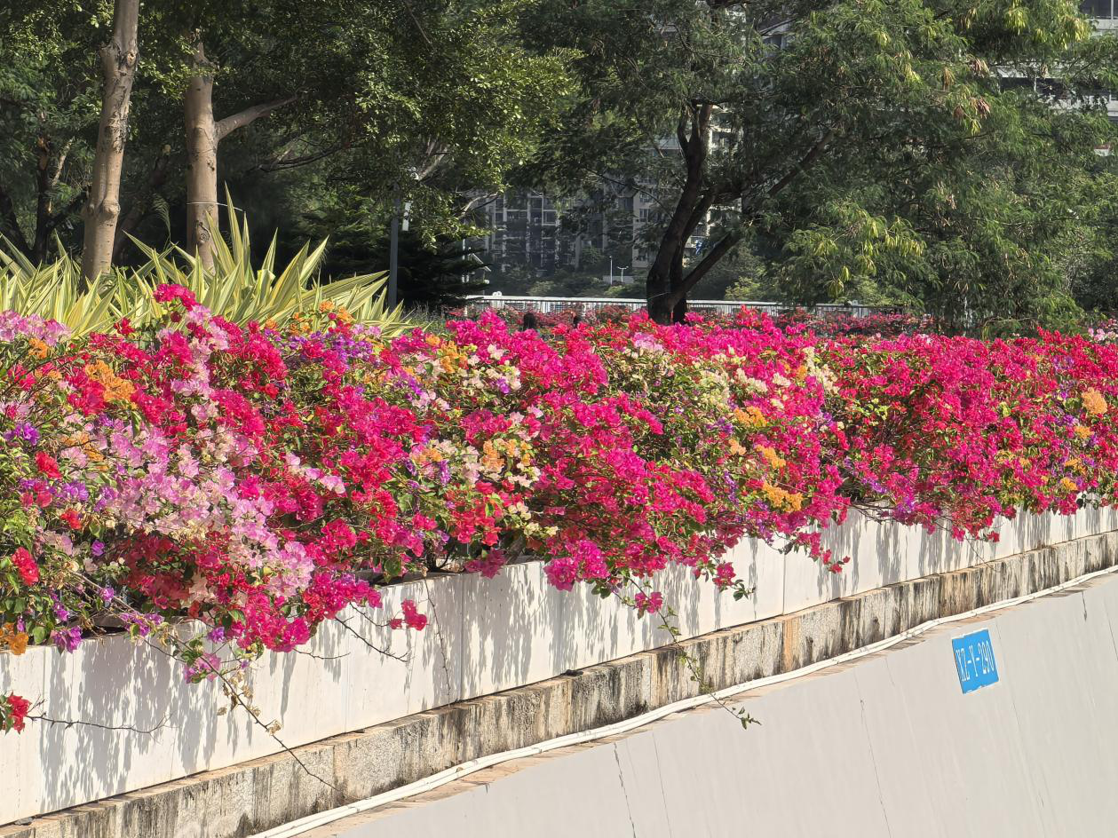 “恰逢十五运会,好多人看到宝安繁花盛开,其实这里的每一寸绿意、每一抹亮色,都不是偶然的绽放,而是点线面全方位兼顾的用心浇灌。”陆远珍告诉记者,乔木和灌木的花期其实可以人为调整,但是往往需要提前一年的时间来把控植物的生长。宝安城管部门与宝安交通集团平通公司携手提前谋划,以宝安中心区中轴线为延展核心,沿着纵横交错的城市路网系统有序推进。针对那些歪斜倾倒的“歪树”、断裂的“断头树”,还有各类长势差、形态杂乱的不良植株,逐一对标、分类施策——或扶正、加固,或复壮、补植,让曾经的“视觉瑕疵”重焕生机。同时引入科学养护技术,精准调控水肥、优化病虫害防治方案,让每一株花草树木都能长得枝繁叶茂、姿态优美。