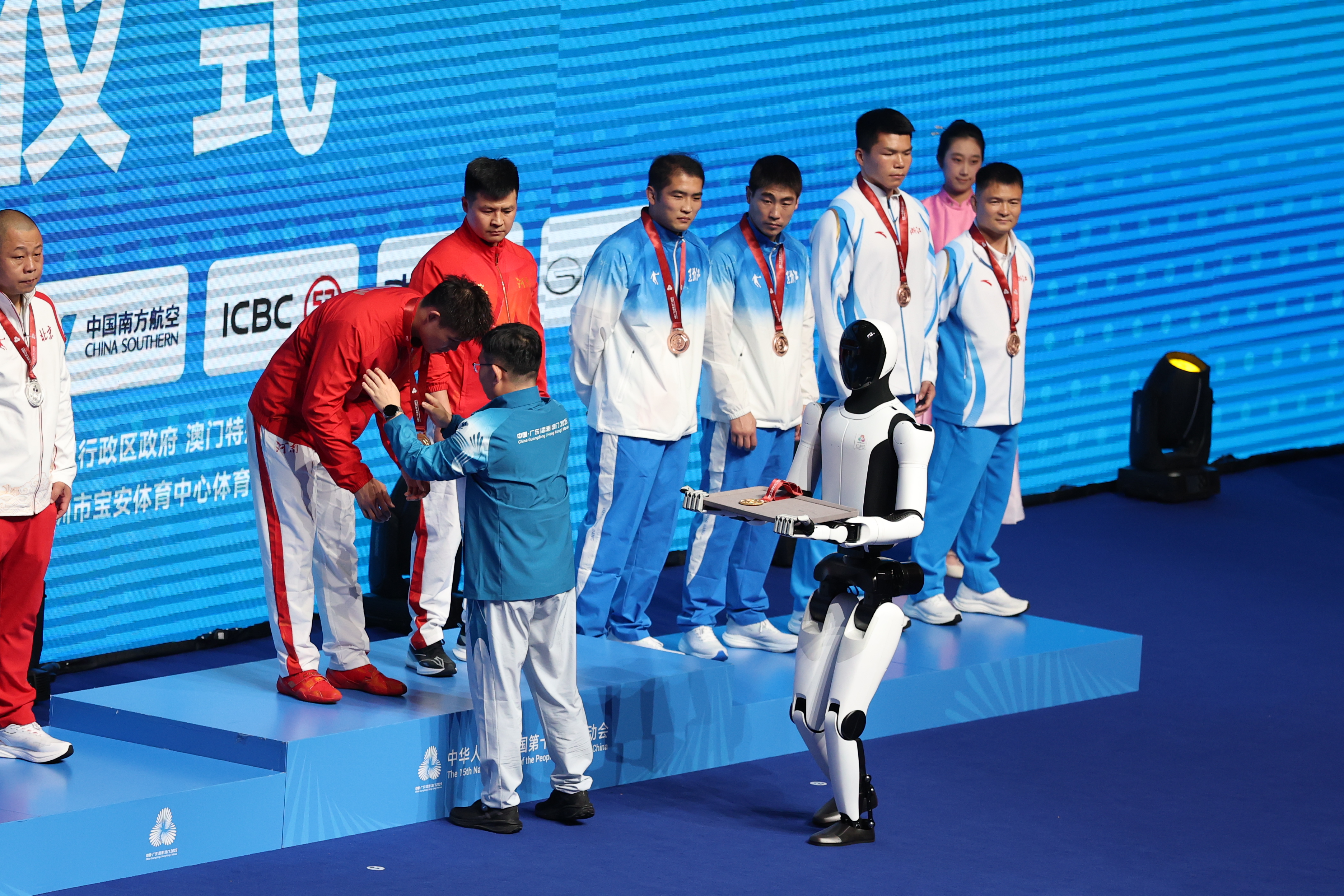 11月14日下午,广东深圳,第十五届全运会拳击比赛颁奖仪式,深圳品牌优必选机器人亮相颁奖环节,手持奖牌托盘协助完成颁奖。这是全运会竞技赛事首次引入机器人参与颁奖流程。值得一提的是,十五运会开幕式上,优必选机器人通过敲击青铜句鑃完成了一场“古今对话”表演,成为全球首个在国家级综合性运动会中担任开幕嘉宾的人形机器人。