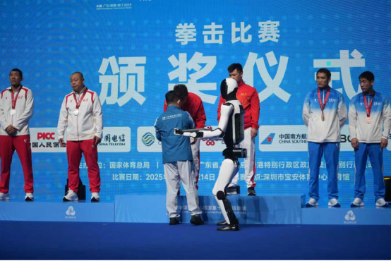 11月14日,在十五运会拳击比赛的收官日,男子92公斤级颁奖仪式上出现了令人惊喜的颁奖助手:人形机器人。