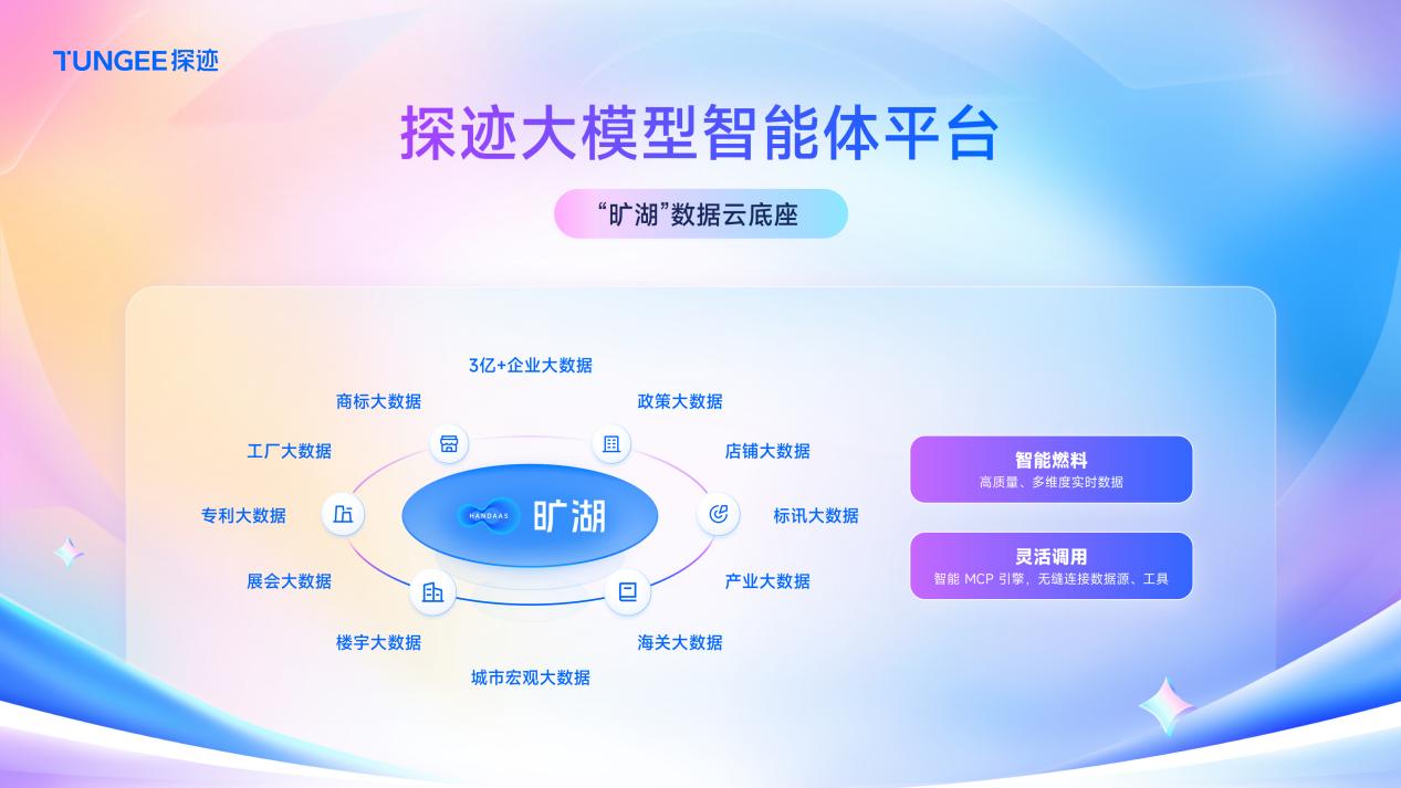 旷湖数据云作为平台的“数据血液”,汇聚了海量、多维度、实时更新的商业数据,为模型训练与决策提供可靠支撑。通过智能MCP引擎封装数据接口,该平台支持Agent直接调用,并结合灵活的DaaS订阅模式,显著降低了企业的数据使用门槛。