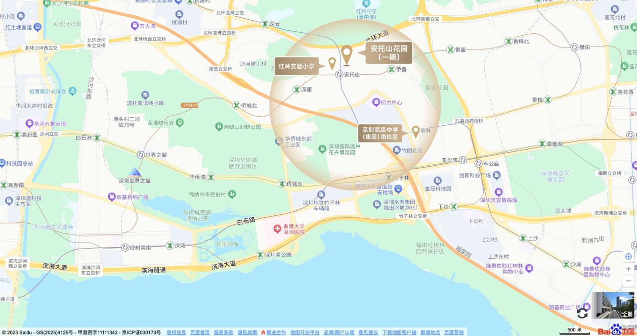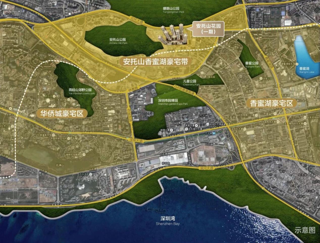 每个深圳人心中都有一处香蜜湖。安托山花园(一期)坐落于福田香蜜湖-安托山片区,归属香蜜湖板块且接壤华侨城,占据城市核心区位,享有“两山一湖六公园”的自然格局。这里不仅人文底蕴醇厚,自然生态与城市繁华共生,更汇聚了优质教育、醇熟商业、静谧居住环境与高端圈层资源。