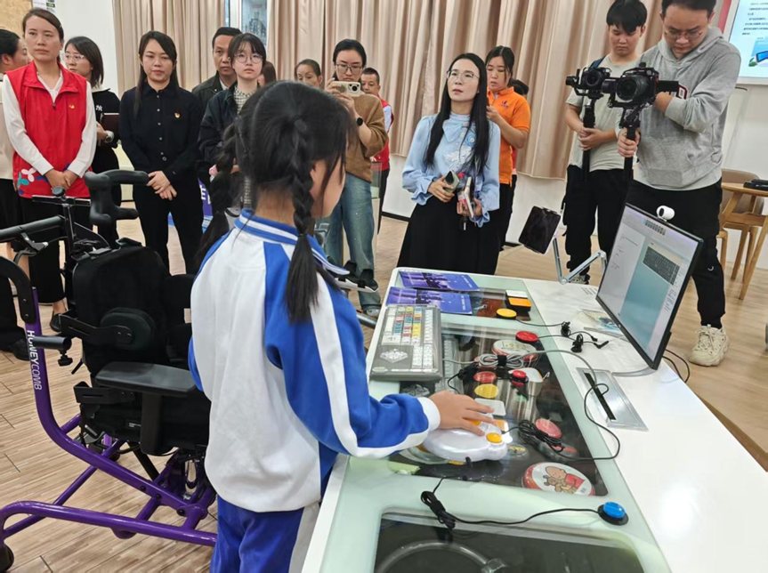 在AI多模控制轮椅挑战区,参与者仅凭呼吸、头控或手势,即可灵活操控轮椅,完成绕桩、踢球、投壶等任务。儿童沟通辅具游乐场内,孩子们借助呼吸传感器、触摸传感器等AI沟通辅具操控玩具,顺利体验了“吹动保龄球”“眼动打地鼠”等趣味项目。