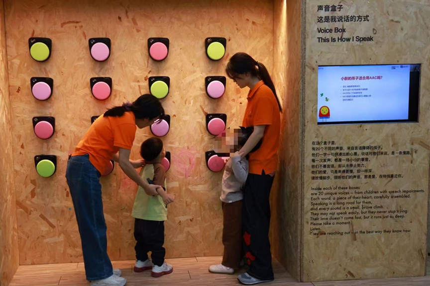社区居民倾听言语障碍孩子的声音盒子。