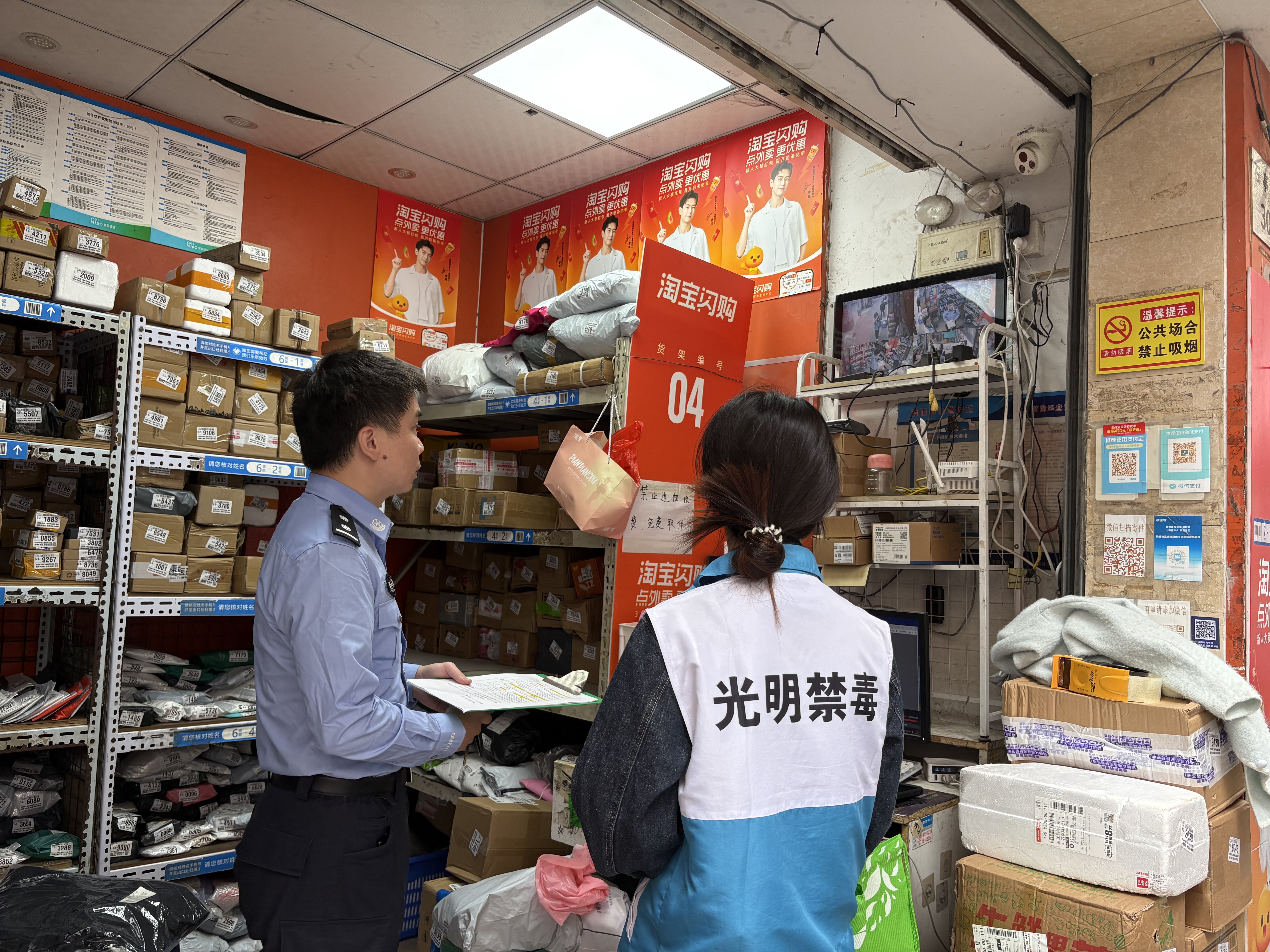 此外,玉塘街道创新将新就业群体纳入禁毒宣传体系。街道平安办联合派出所开展“筑牢禁毒防线,守护平安包裹”专项行动,聚焦快递站点等重点场所,通过检查包裹、查看监控、现场培训等方式,强化“实名收寄、开箱验视、过机安检”三项制度落实。活动针对快递员“走街串巷、接触面广”的工作特点,重点培训毒品识别、可疑包裹甄别等技能,将快递小哥培育成禁毒“流动哨兵”,为寄递渠道安全保驾护航。