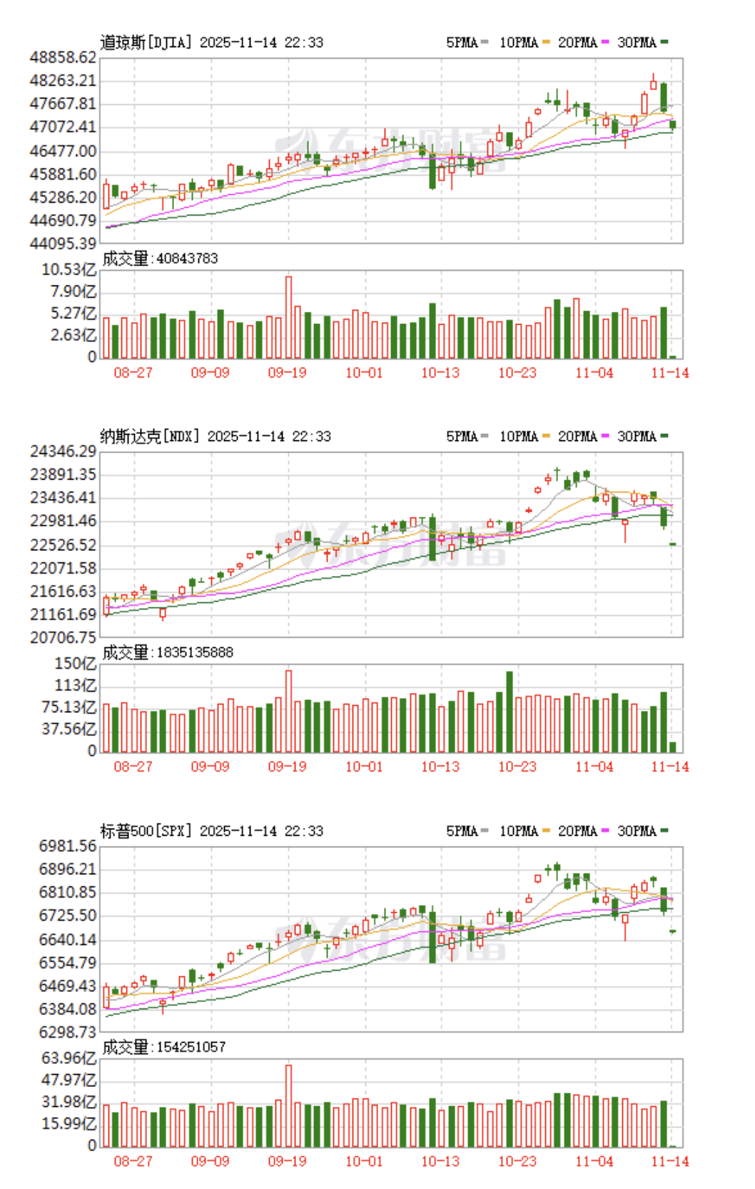 11月14日,美股开盘,三大股指大幅低开,道指跌0.78%,纳指跌1.42%,标普500指数跌1.07%。