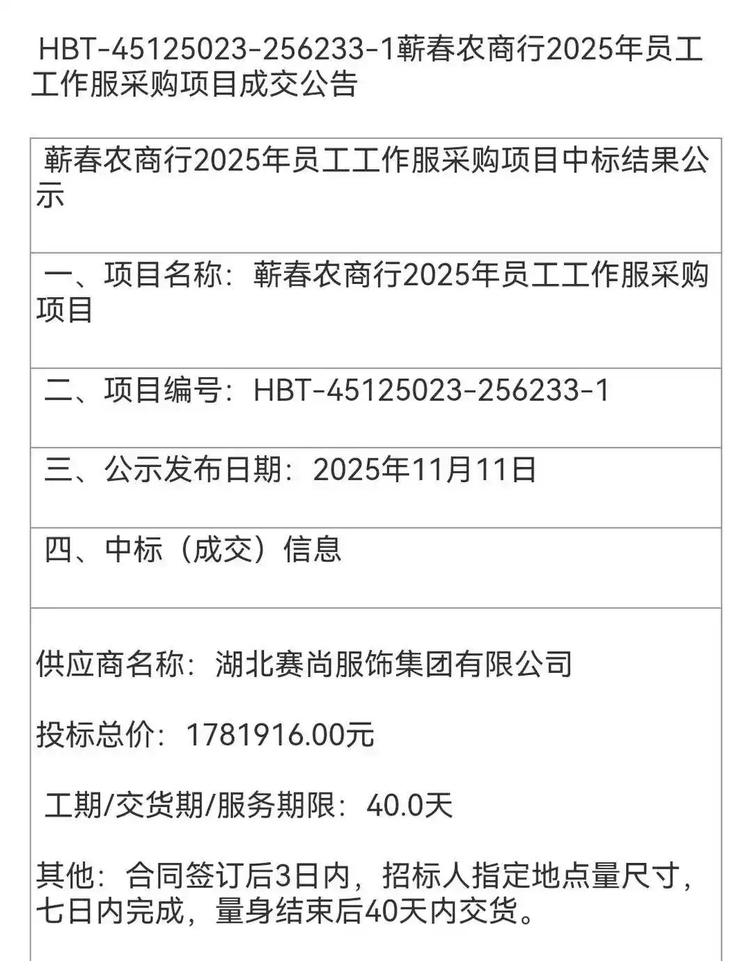 值得关注的是,2024年、2022年,湖北赛尚服饰集团有限公司也都中标了蕲春农商行的工作服采购项目。其中,2024年中标金额114.2万元,2022年中标金额68.3万元。2022年为分类招标,总金额326.5万元;2024年与2025年为打包采购,2025年采购金额较2024年增长56%,且采购周期仅间隔一年。