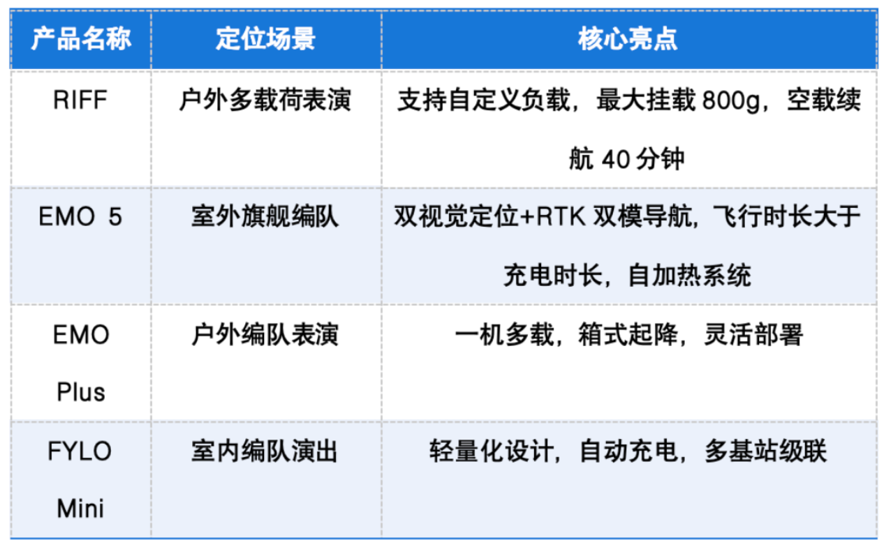 其中,RIFF作为行业首款“多功能融合表演平台”,采用标准化接口设计,支持同时挂载冷烟花、爆闪灯、烟雾器、灯笼、孔明灯等多类特效设备,实现“一机多能,一飞多效”。EMO Plus在经典机型基础上全面升级,突破性地实现单机同时搭载烟花与爆闪灯,配合箱式起降系统,大幅提升演出效率与艺术表现力。EMO 5作为室外编队旗舰产品,搭载双视觉定位+RTK双模导航系统,有效抵御信号干扰,动力系统提升50%,飞行速度提升120%,配备自加热系统,实现-30℃极端环境下的稳定飞行。FYLO Mini作为全球最轻量化的量产级室内编队无人机,支持箱式起降与自动充电,具备多基站级联能力,为室内常态化表演提供全新解决方案。